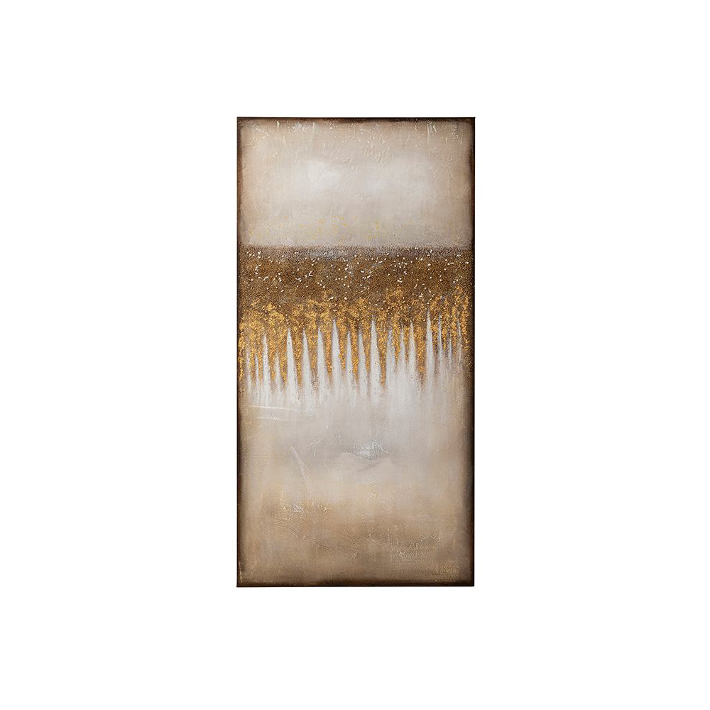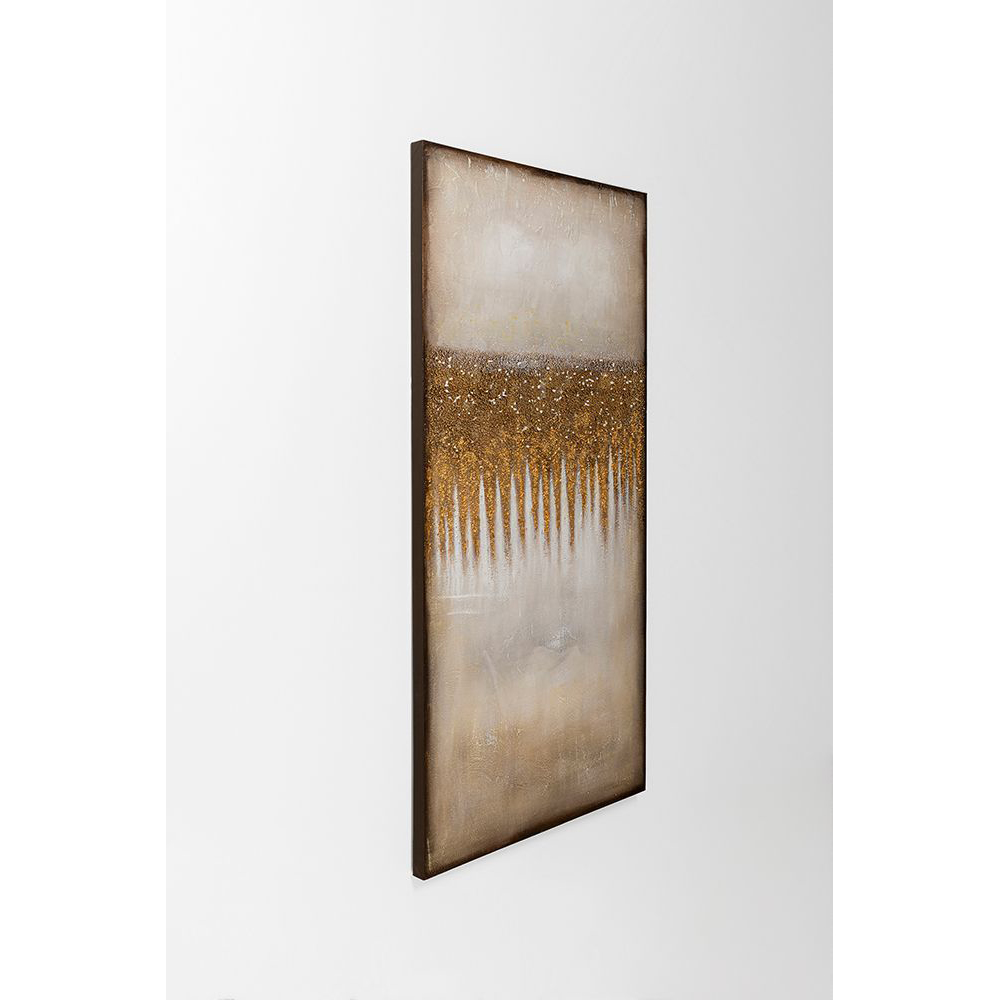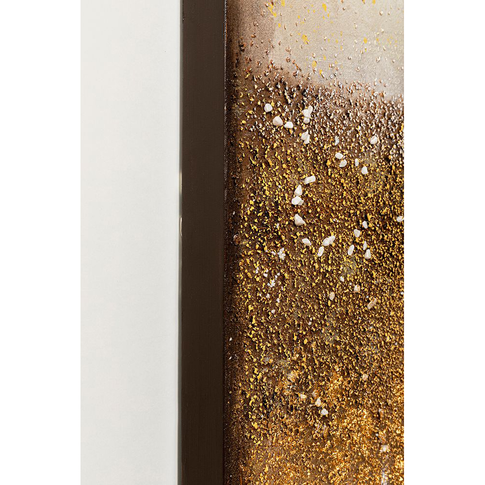 Ein dreidimensionales Band aus Steinchen und Goldtupfern zieht sich wie Sternenstaub über das Gemälde und verleiht ihm eine besondere Ausstrahlung. Das Bild ist rahmenlos und die Leinwand wurde auf einen Massivholzrahmen gespannt, was seine Schönheit zusätzlich unterstreicht.