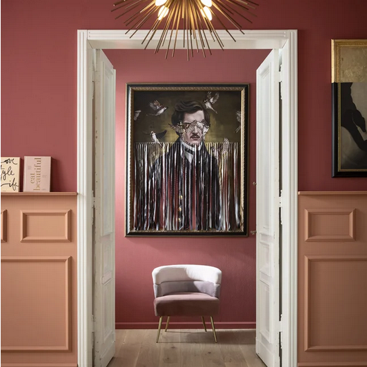 - Klassik oder moderne Kunst? Sehr großes Wandbild im Hochformat mit surrealem Herrenporträt und mit einem Rahmen im Vintage-Stil