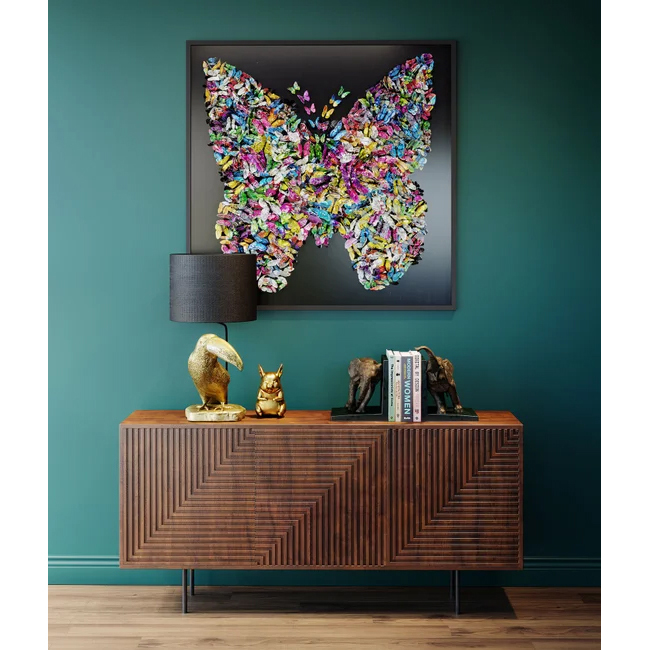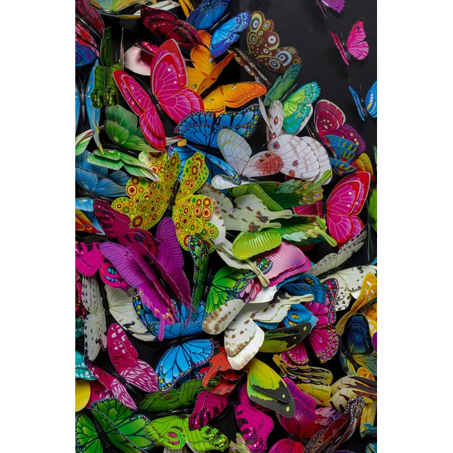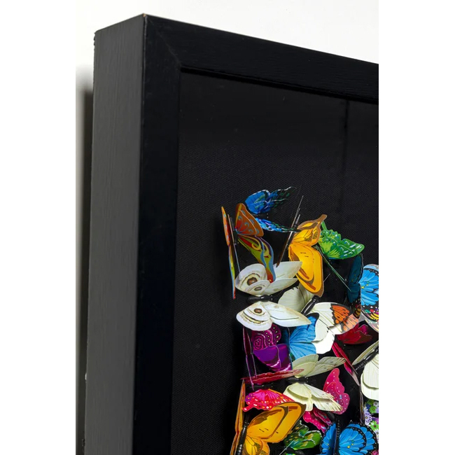 - Schwarzer Hintergrund und schwarzer Holzrahmen: Das Werk mit dreidimensionalen Papierfaltern leuchtet in Regenbogenfarben