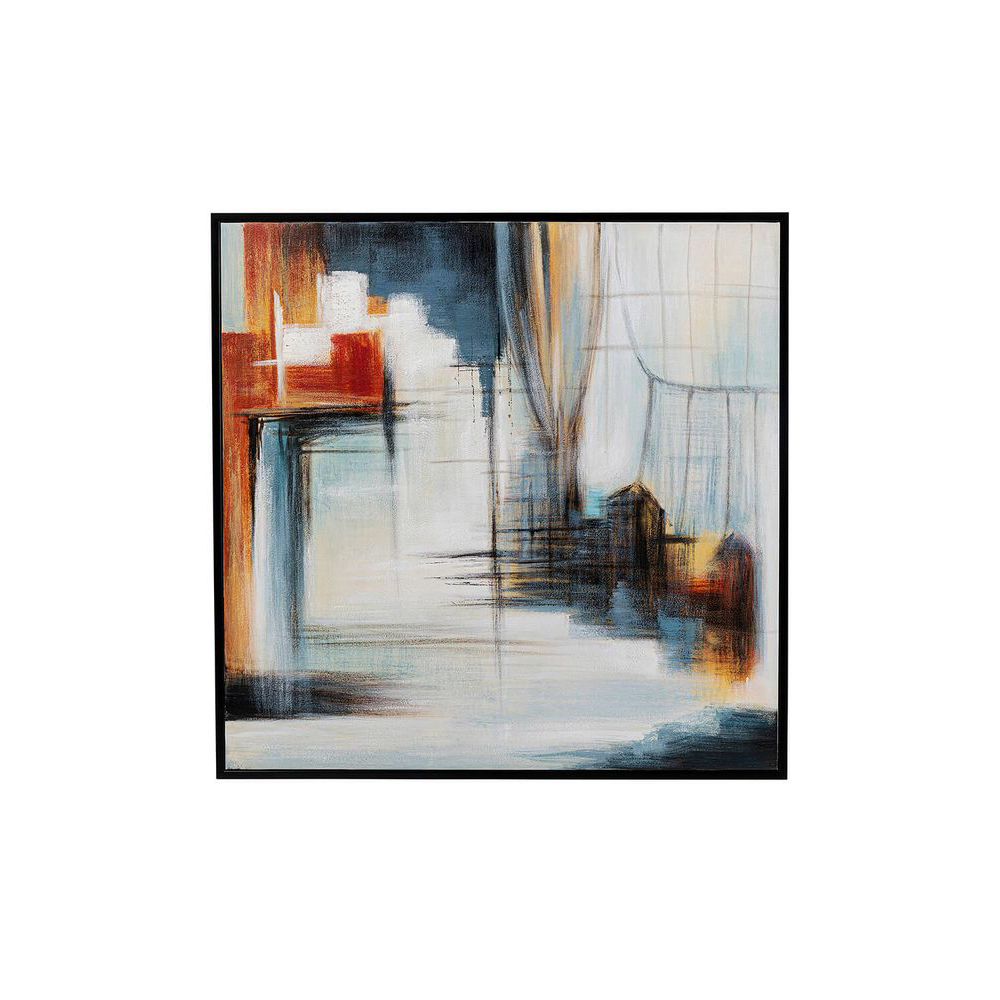 Dieses abstrakte Bild auf Leinwand wird mit einem eleganten Rahmen geliefert. Jedes Stück ist ein individuelles Unikat, das von Hand gemalt wurde. Das abstrakte Design zeigt eine Kombination aus Rot, Blau, Weiß, Gelb und Schwarz. Der hochwertige schwarze Rahmen verleiht dem Bild eine edle Note.