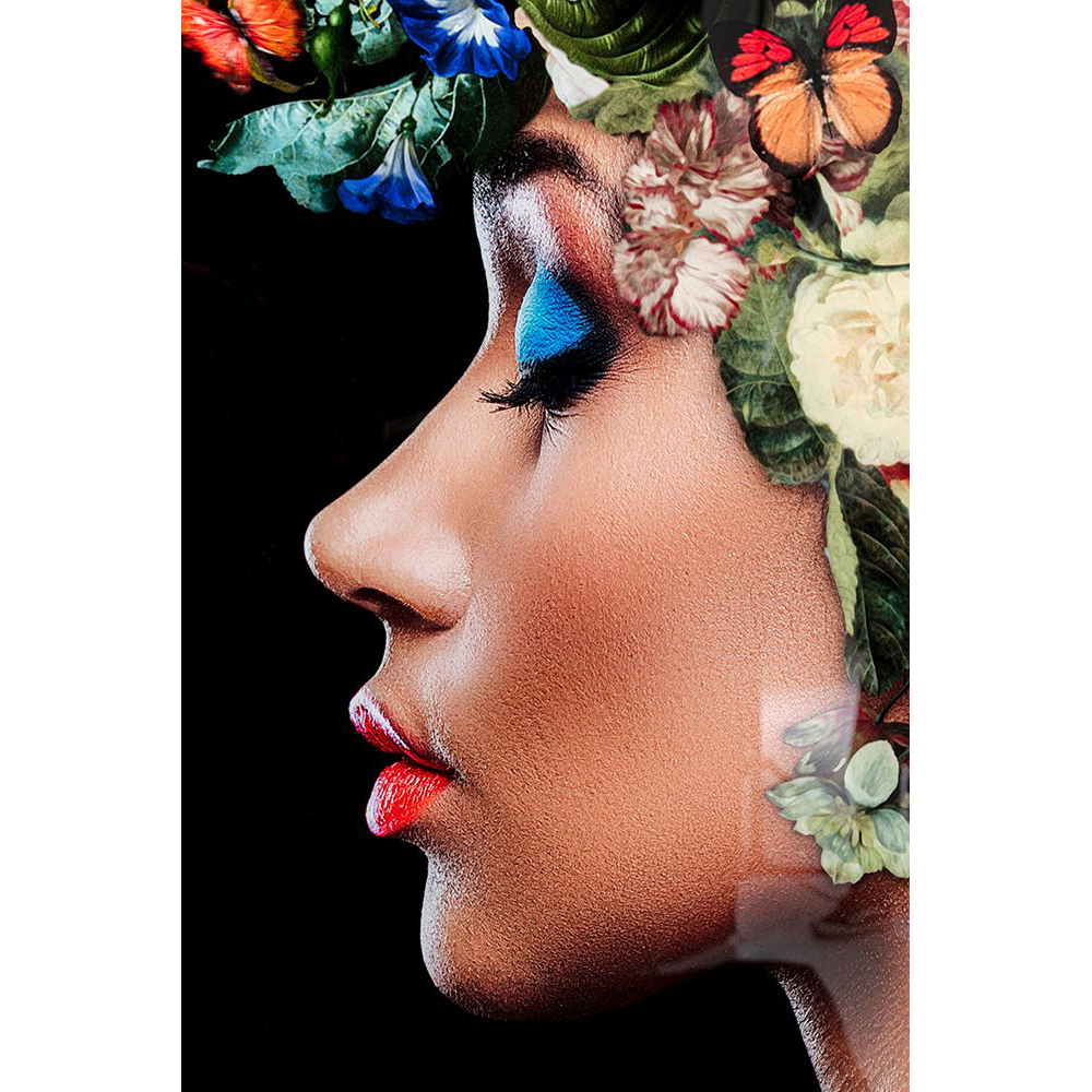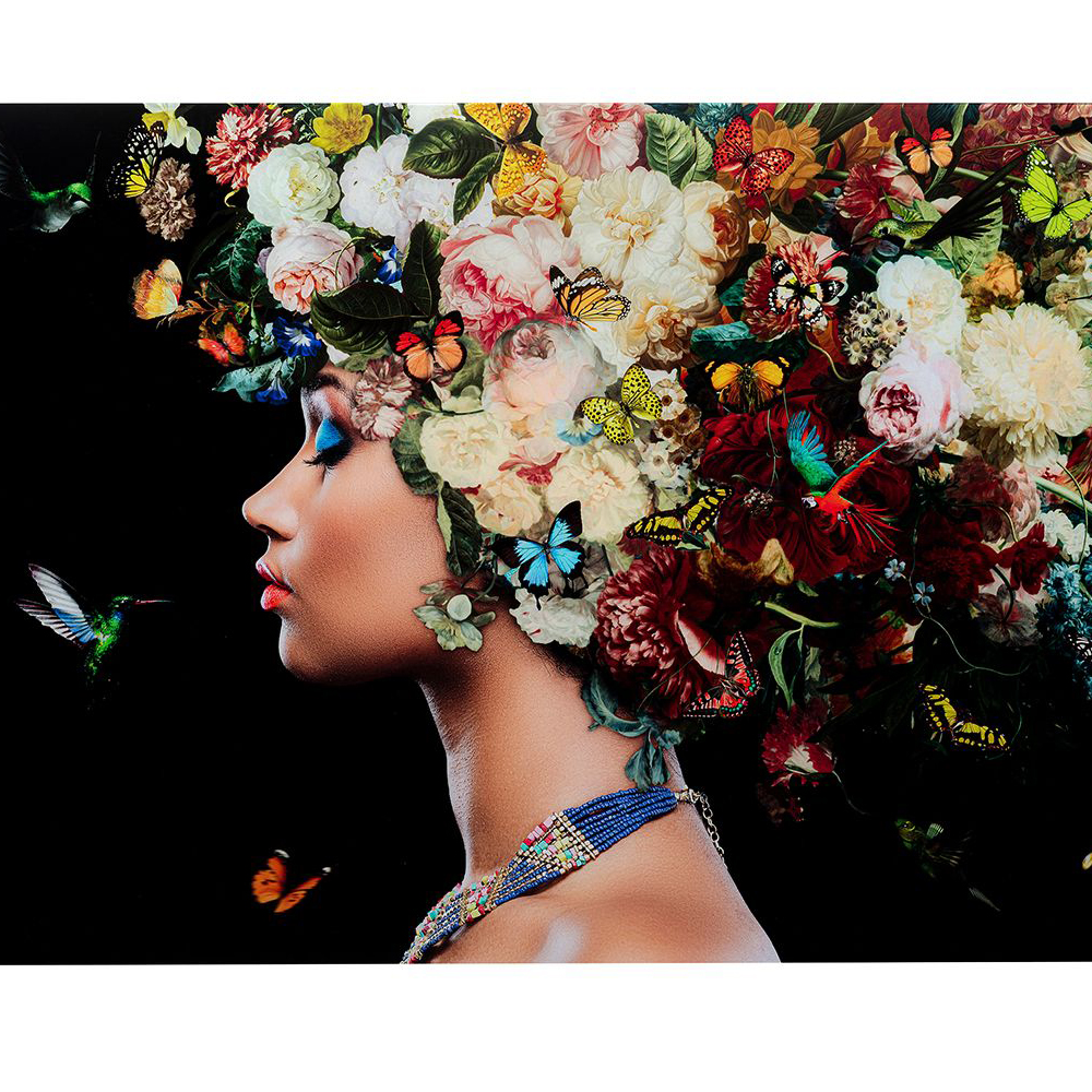 Großes Glasbild im Querformat mit einem Motiv aus Blüten, Schmetterlingen, Vögeln und einem Portrait. Das Bild ist auf pflegeleichtem ESG-Sicherheitsglas foliert. Egal ob im Industrial oder Country Stil - bunte Wandbilder wie dieses bringen Leben in jeden Wohnraum.