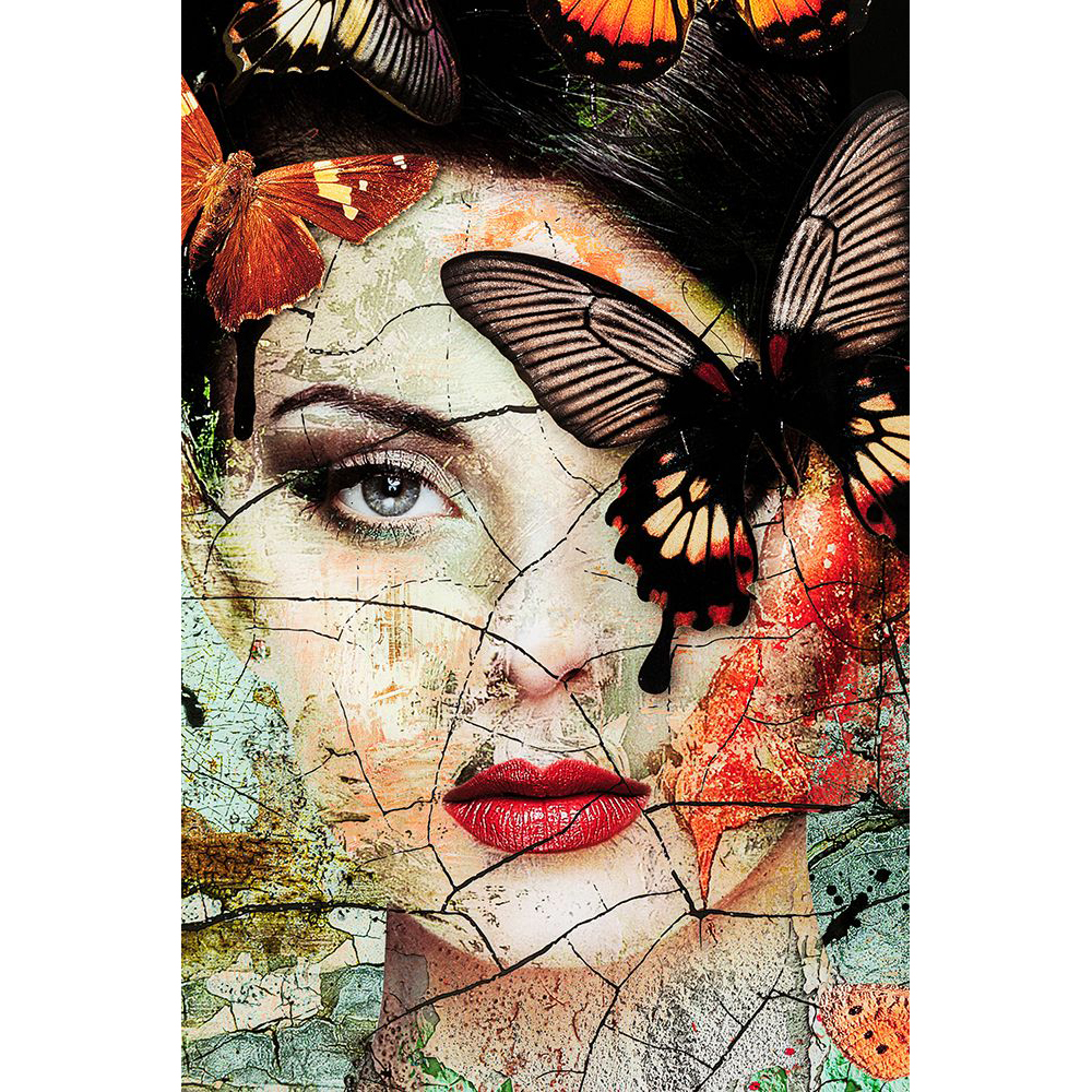 Dieses farbenfrohe Glasbild mit schwarzen Elementen misst 150 x 100 x 0,4 Zentimeter (H/B/T) und zeigt eine kunstvolle Kollage mit Schmetterlingen und einem Frauenportrait. Es ist ein echter Blickfang und eignet sich perfekt als Wanddekoration für das Wohnzimmer oder Schlafzimmer. Hergestellt aus hochwertigem ESG-Sicherheitsglas, ist dieses Bild robust und langlebig.