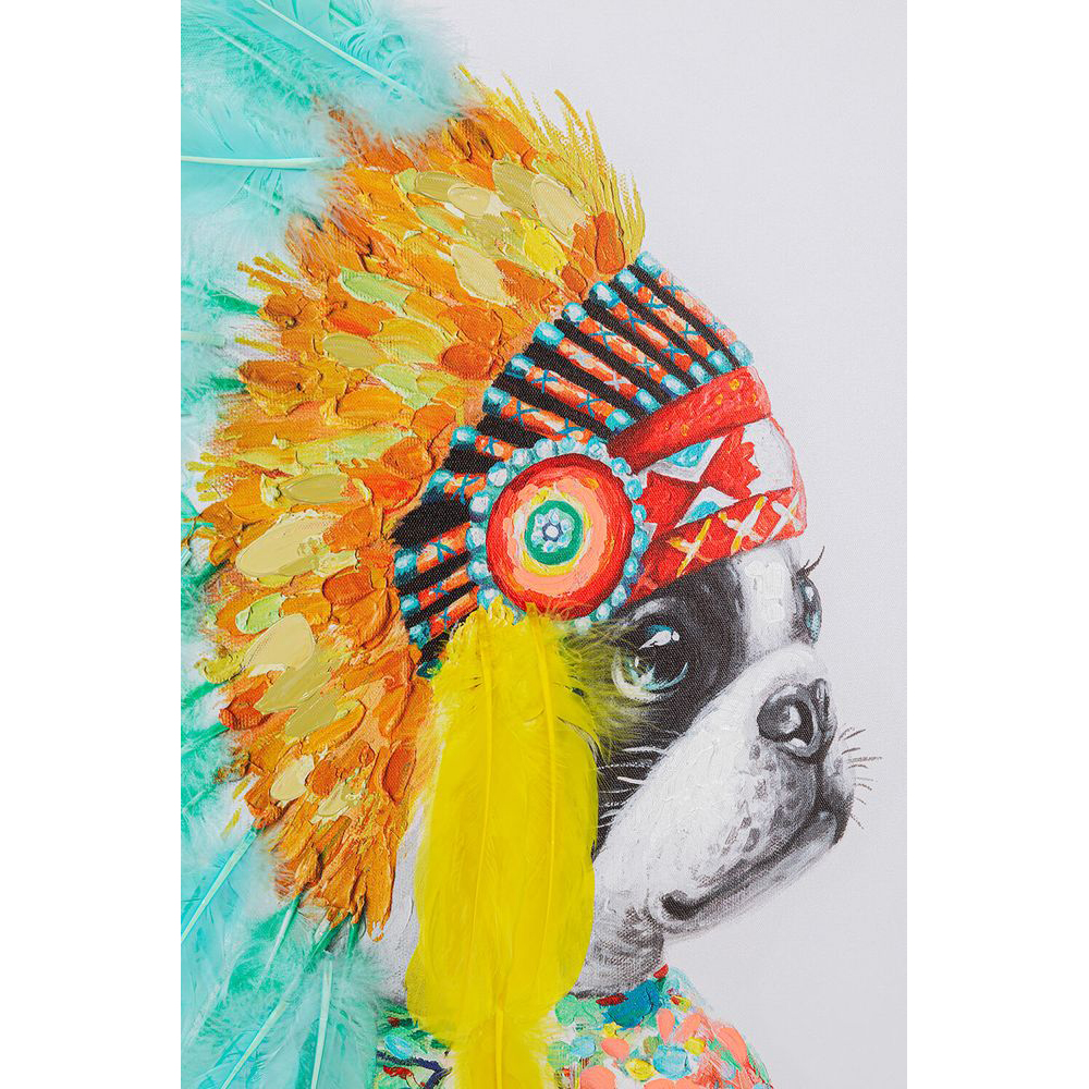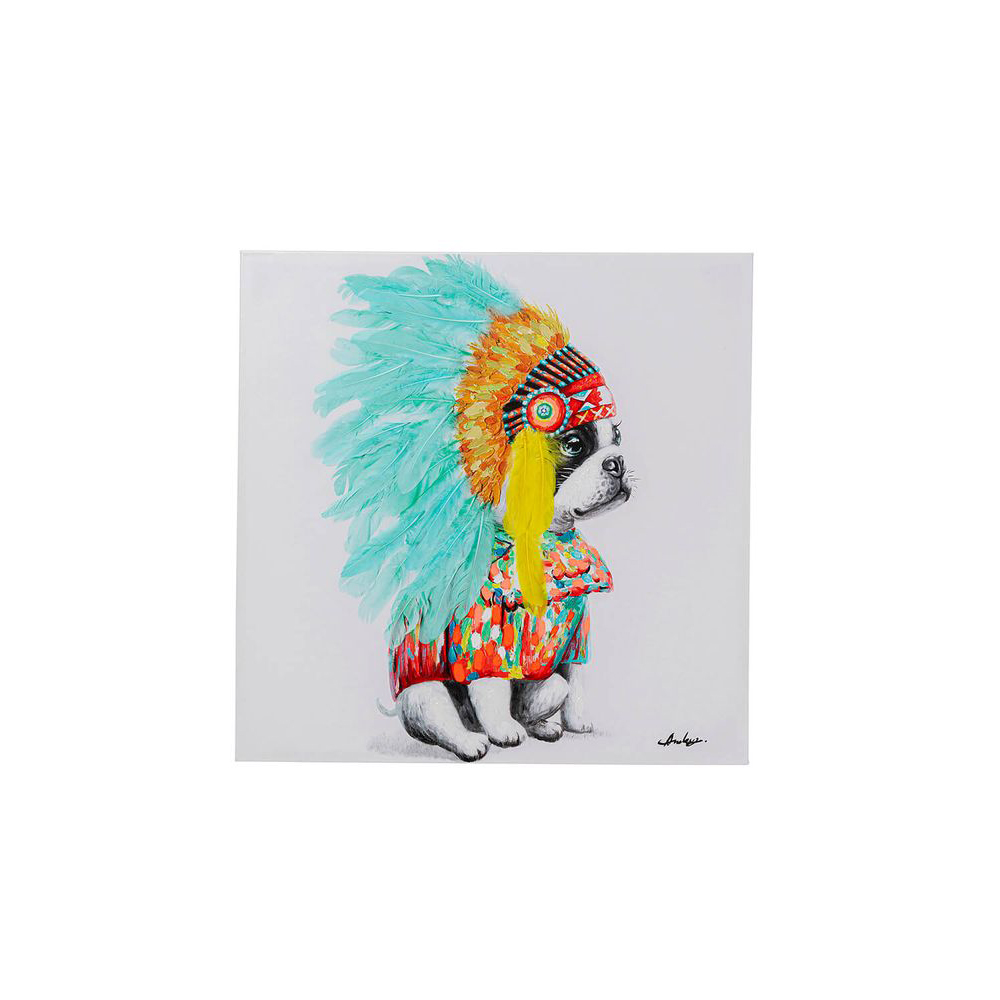 Eine humorvolle Deko-Idee ist dieses quadratische Wandbild mit einem Hundmotiv. Es wurde handgefertigt und mit echten Federn in den Farben Türkis und Gelb verziert. Diese bunte Wanddekoration ist ideal für jeden Raum und besteht aus Acrylmalerei auf Leinwand, montiert auf einem stabilen Rahmen aus Massivholz.