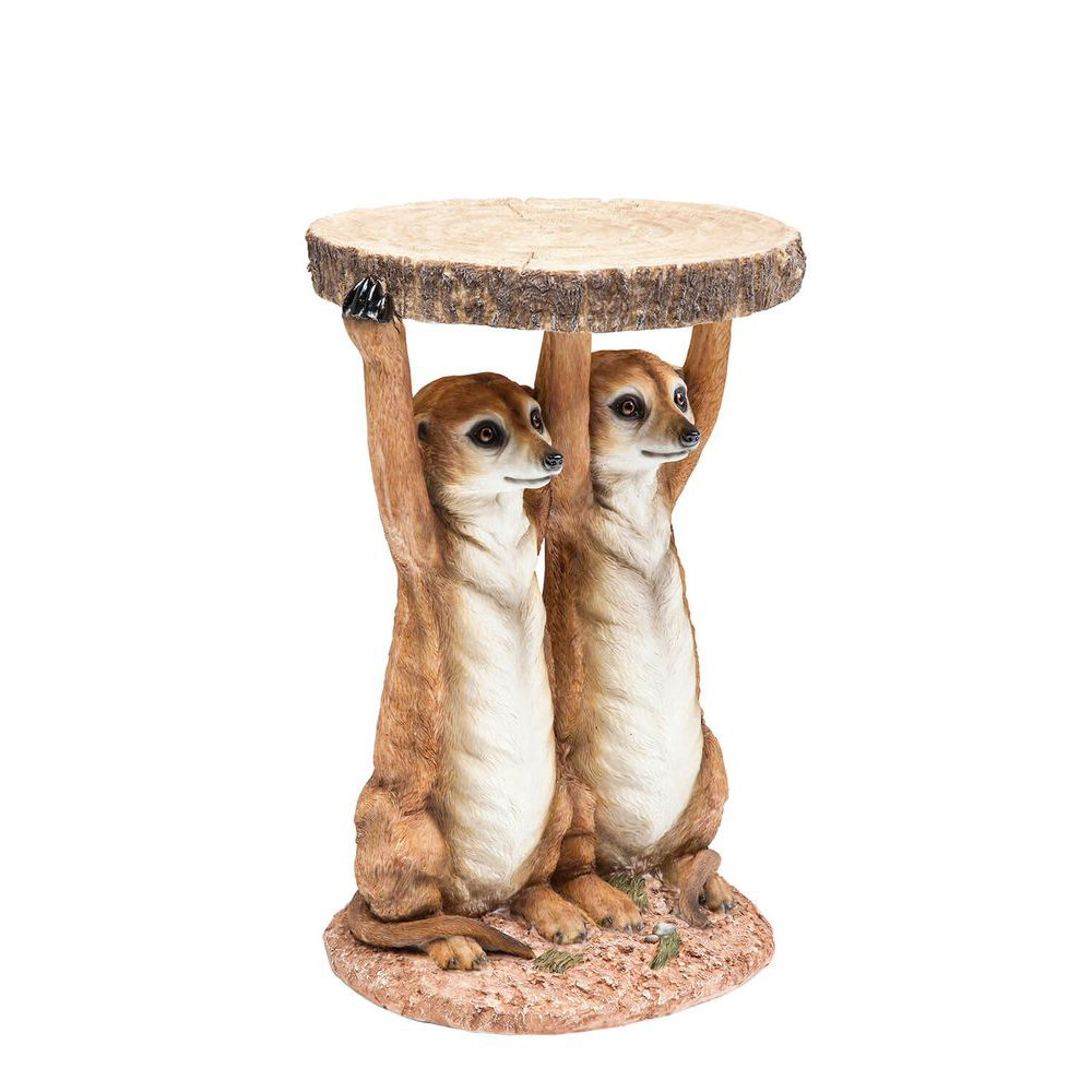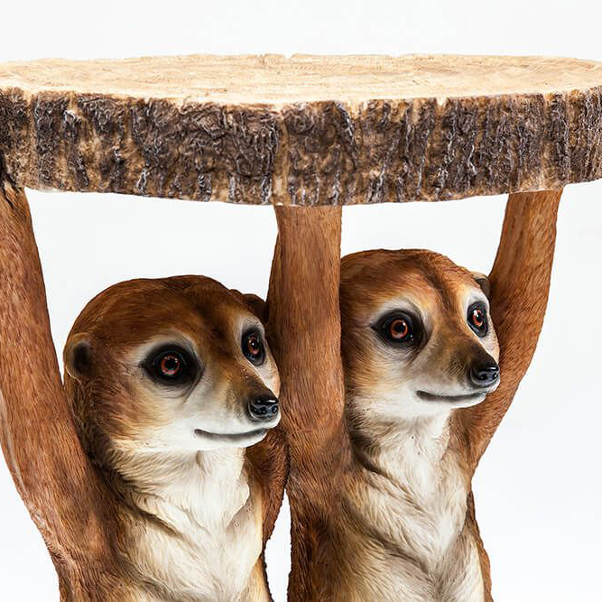 Erdmännchen-Duo Die charmanten Tiere sind für ihre lebhafte Natur und ihre unerschrockene Neugierde bekannt, die sie oft in ungewöhnliche Situationen führt. Eine davon ist die Verwendung als Beistelltisch. In diesem Doppelpack halten die beiden Erdmännchen die Tischplatte hoch und schauen dabei so verschmitzt, dass es eine wahre Freude ist, sie zu betrachten. Der Beistelltisch "Meerkat Sisters" fügt sich hervorragend in eine fantasievoll gestaltete Leseecke oder dient als dekoratives Element für Pflanzen.