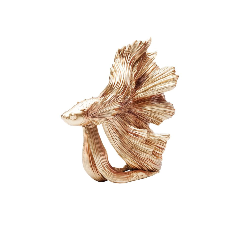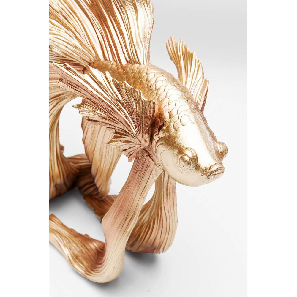 Eine goldene Deko-Skulptur mit einem Fischmotiv, inspiriert von einem siamesischen Kampffisch. Jedes Exemplar ist handgefertigt und somit einzigartig. Hergestellt aus robustem Polyresin und anschließend lackiert. Die Kombination aus glamourösem Gold und einem Hauch Exotik verleiht jedem Raum eine besondere Note.