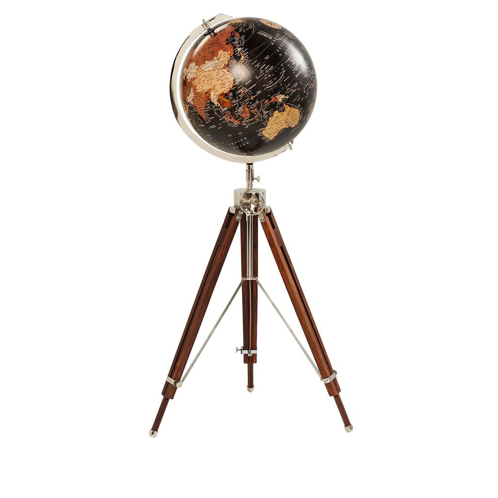 Ein im Vintage-Stil gehaltener großer Stand-Globus, dessen massives Dreibein-Gestell höhenverstellbar ist, verleiht jedem Raum einen Hauch von Nostalgie. Hergestellt aus hochwertigem Massivholz, Aluminium und Edelstahl, strahlt dieser Globus mit seinen Farben Schwarz, Beige und Braun ein authentisches Flair aus. Er ist nicht nur ein Blickfang im modernen Wohnstil, sondern passt auch perfekt in Landhäuser und industrielle Lofts.