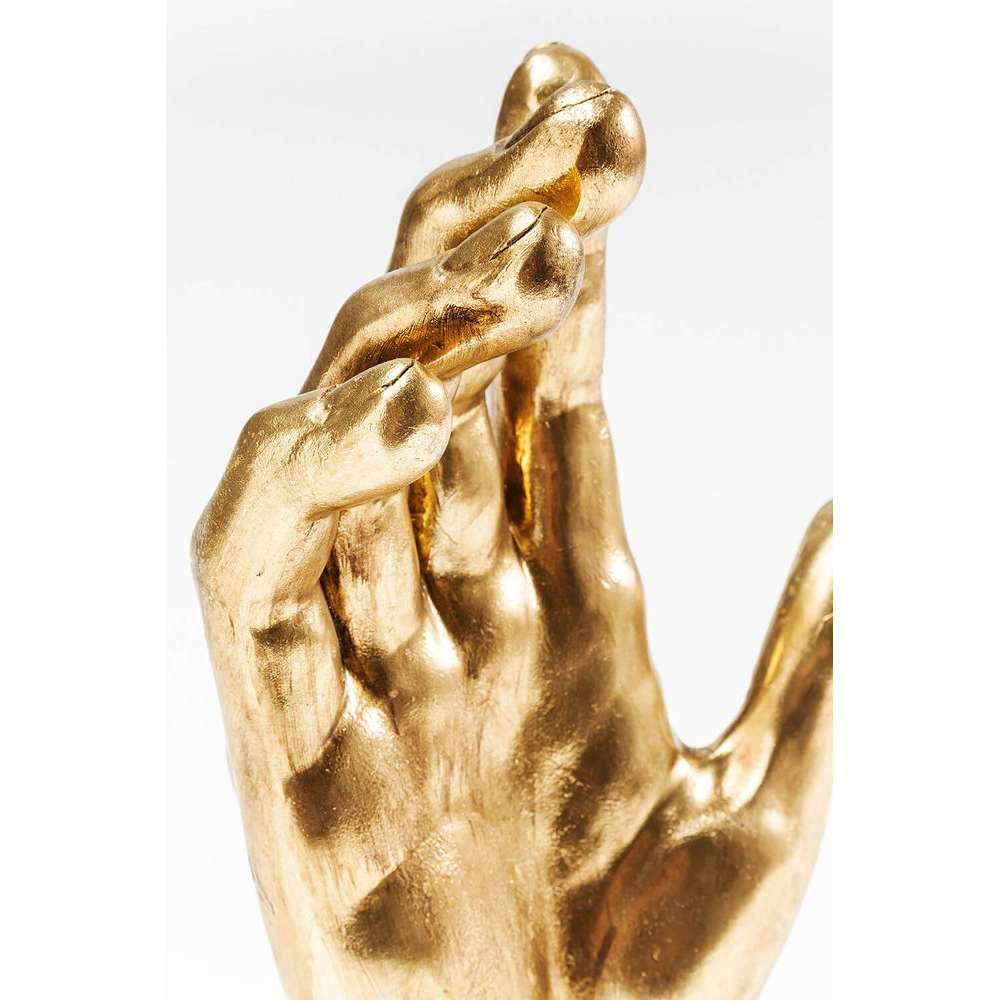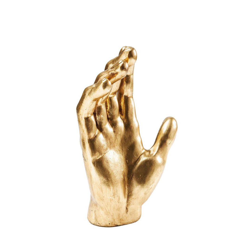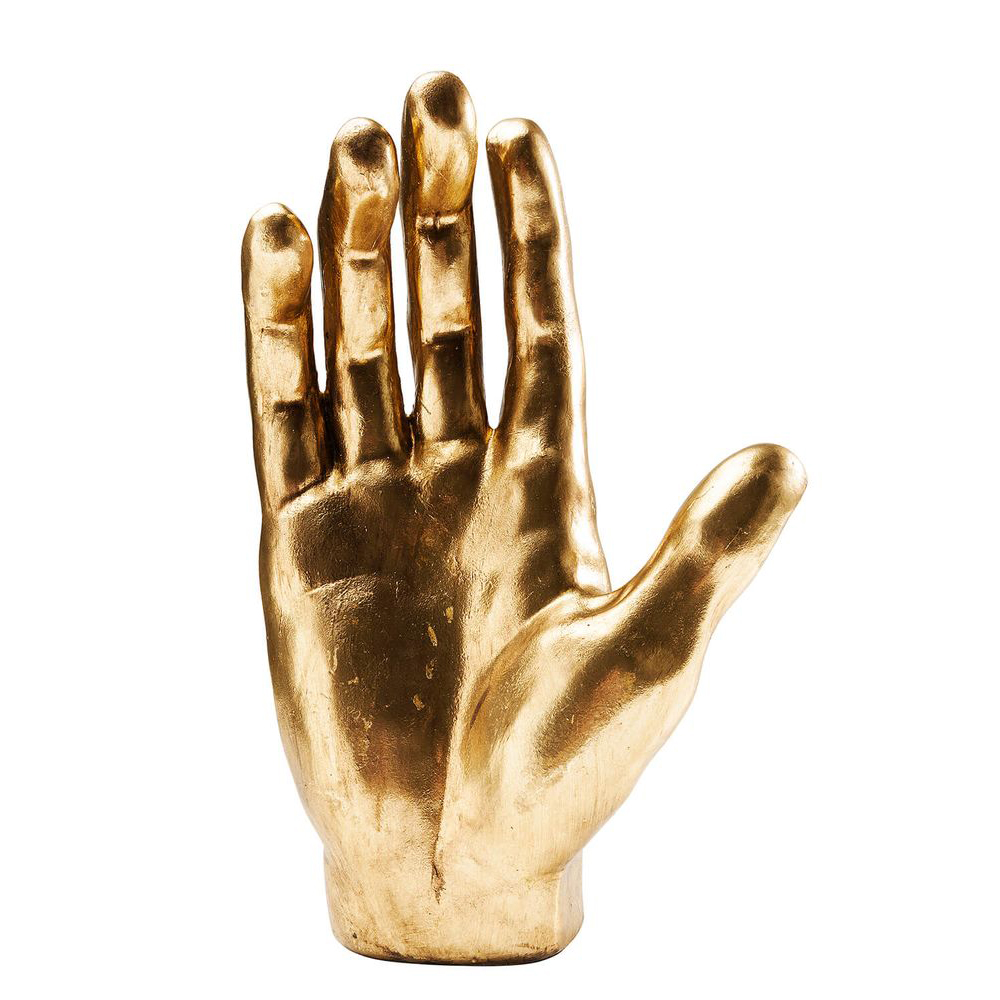 Ein Deko-Objekt in Form einer Hand, präsentiert in einem eleganten Goldton. Diese außergewöhnliche Deko-Idee eignet sich perfekt für Regale, Tische und Konsolen. Die Deko-Hand kann je nach Wunsch aufrecht oder liegend arrangiert werden. Hergestellt aus strapazierfähigem Polyresin und kunstvoll lackiert.