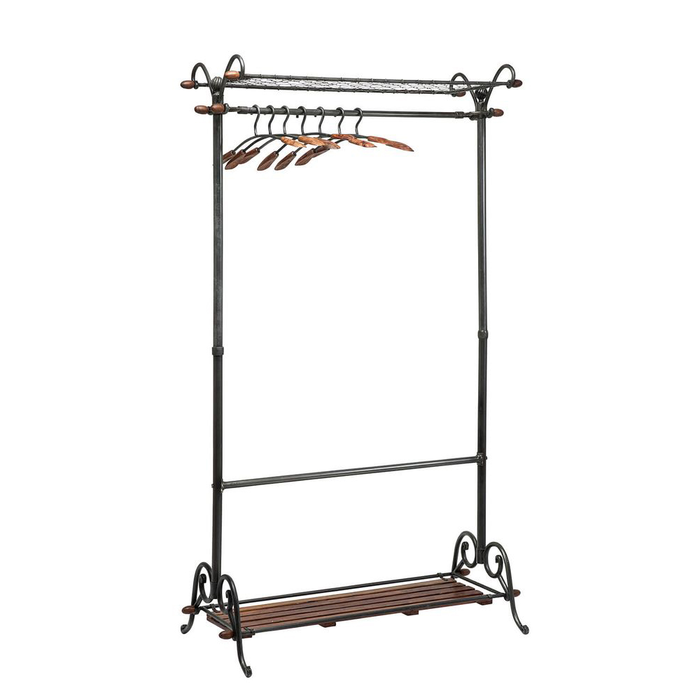 Eine Standgarderobe im Vintage-Stil, gefertigt aus Massivholz und Stahl, mit sorgfältig gearbeiteten Details sowie einer Bügelstange und zwei zusätzlichen Ablagen. Der zeitlose Materialmix aus Holz und Stahl strahlt ein gemütliches Ambiente aus und passt perfekt zum rustikalen Country-Stil oder zum modernen Industrial Loft. Diese praktische Garderobenlösung sorgt für Ordnung im Flur oder im Wartezimmer und bietet ausreichend Platz für Jacken, Mäntel, Schuhe, Schals und Taschen.