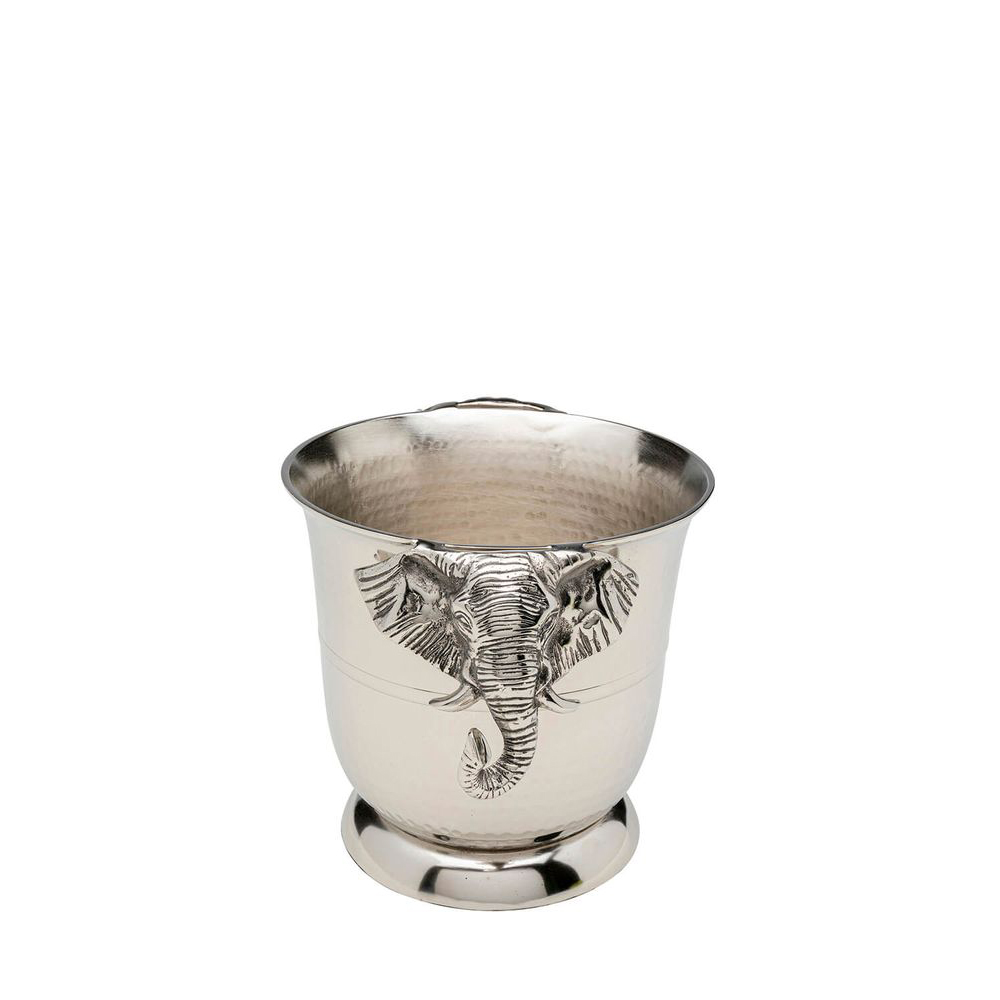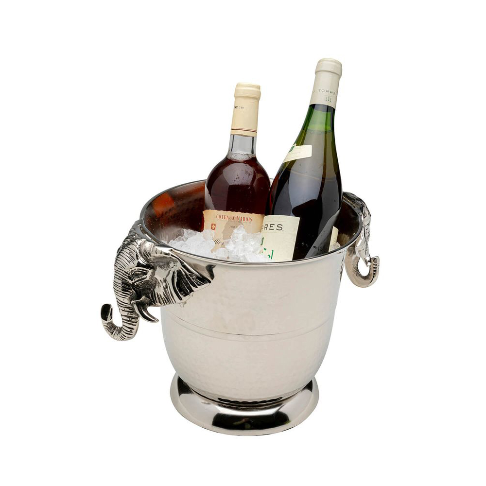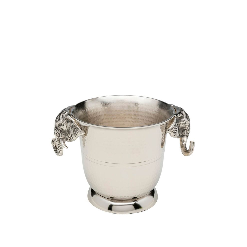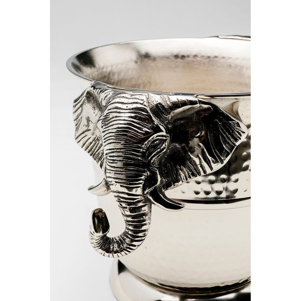 Extravagant gestaltet mit Elefanten als Griffen, verleiht dieser Flaschenkühler jedem Wohnraum eine besondere Note. Hergestellt aus massivem Aluminium und vernickelt, strahlt der Champagner-Kühler Luxus aus und verleiht dem Tisch eine edle Atmosphäre. Perfekt für die Verwöhnung Ihrer Gäste mit optimal temperierten Getränken.
