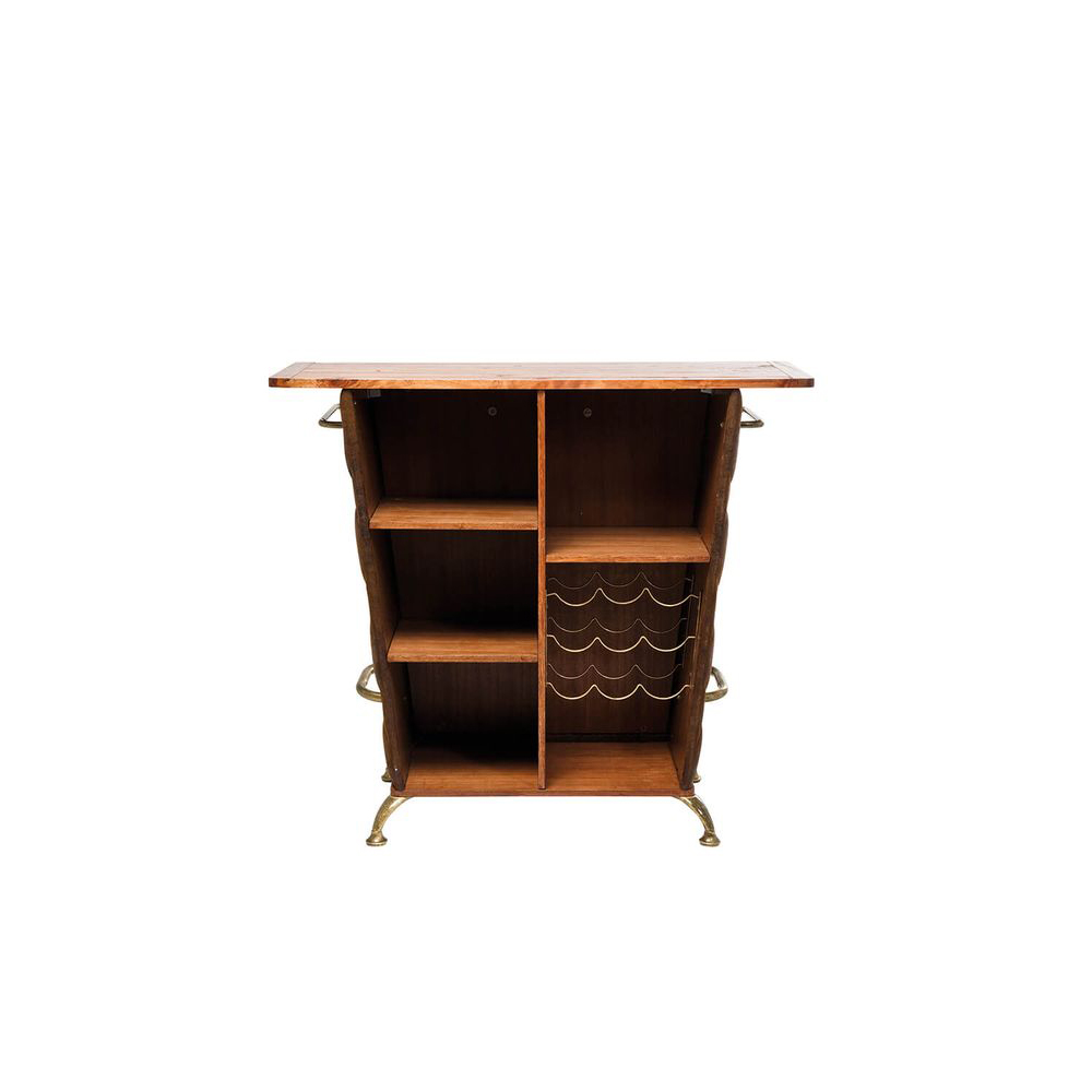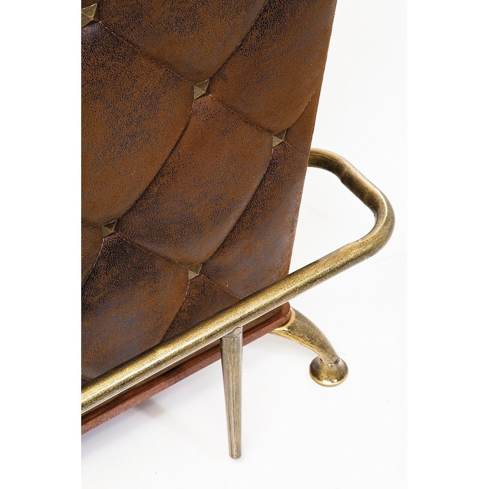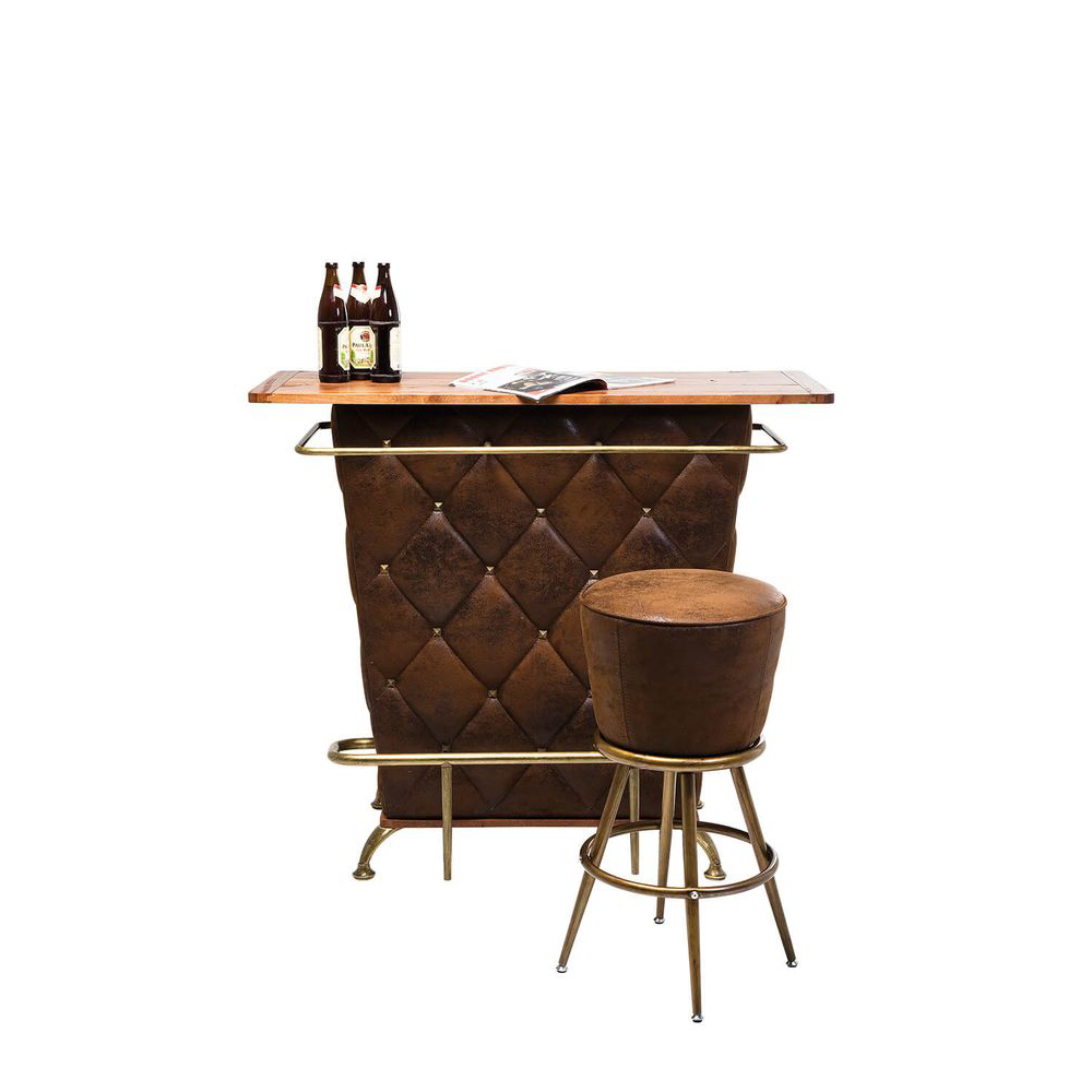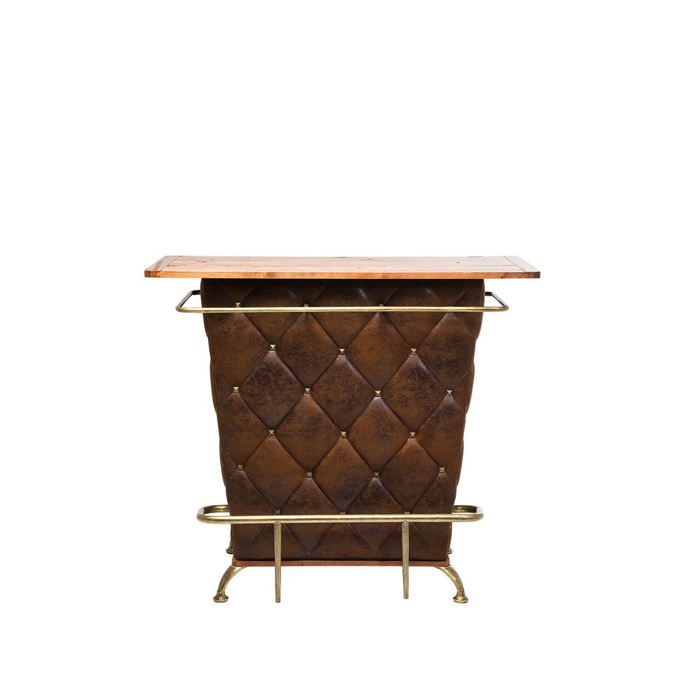 Bar-Tresen im Vintage-Stil fürs Wohnzimmer dessen Herzstück eine rustikale Tischplatte aus handgefertigtem Massivholz bildet. Auf der Rückseite bietet sie ausreichend Platz für Barutensilien, Gläser und Flaschen. Die Reling, Fußstütze und Beine bestehen aus Metall und sind mit einer veredelten Messing-Beschichtung versehen. Hergestellt aus formstabilem MDF, ist der Tisch mit einem pflegeleichten Bezug in Vintageleder-Optik bezogen und mit Knöpfen verziert.