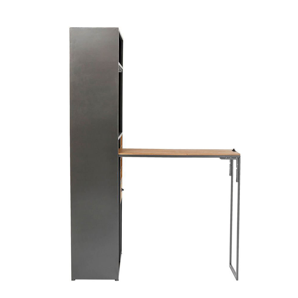 Dank eines einzigen Griffs lässt sich die rustikale Tischplatte aus Tannenholz mühelos als Bartresen ausklappen. Für Barkeeper, die Ordnung lieben, bietet dieses Stahlregal Schienen zum Aufhängen von Stielgläsern, Flaschenfächer und eine praktische Schublade. Die lebendige Holzmaserung kombiniert mit dem anthrazitfarbenen Korpus zelebrieren den angesagten Loft-Stil. Dieser Bartresen ist ein wahres Unikat und wurde liebevoll handgefertigt.