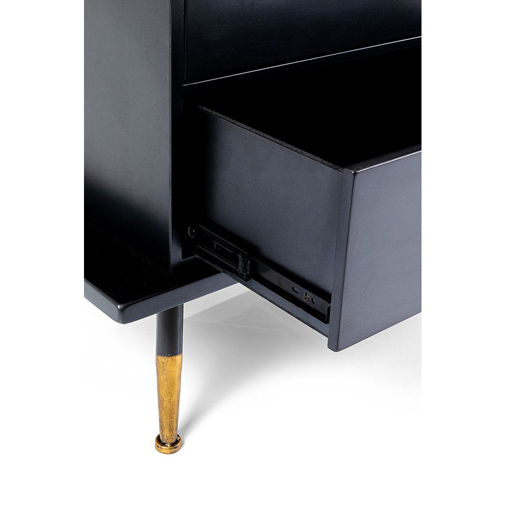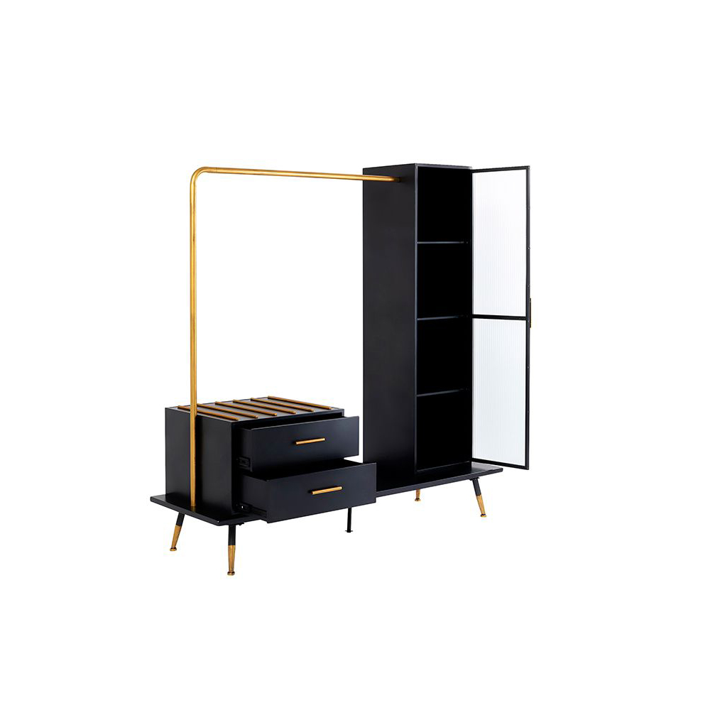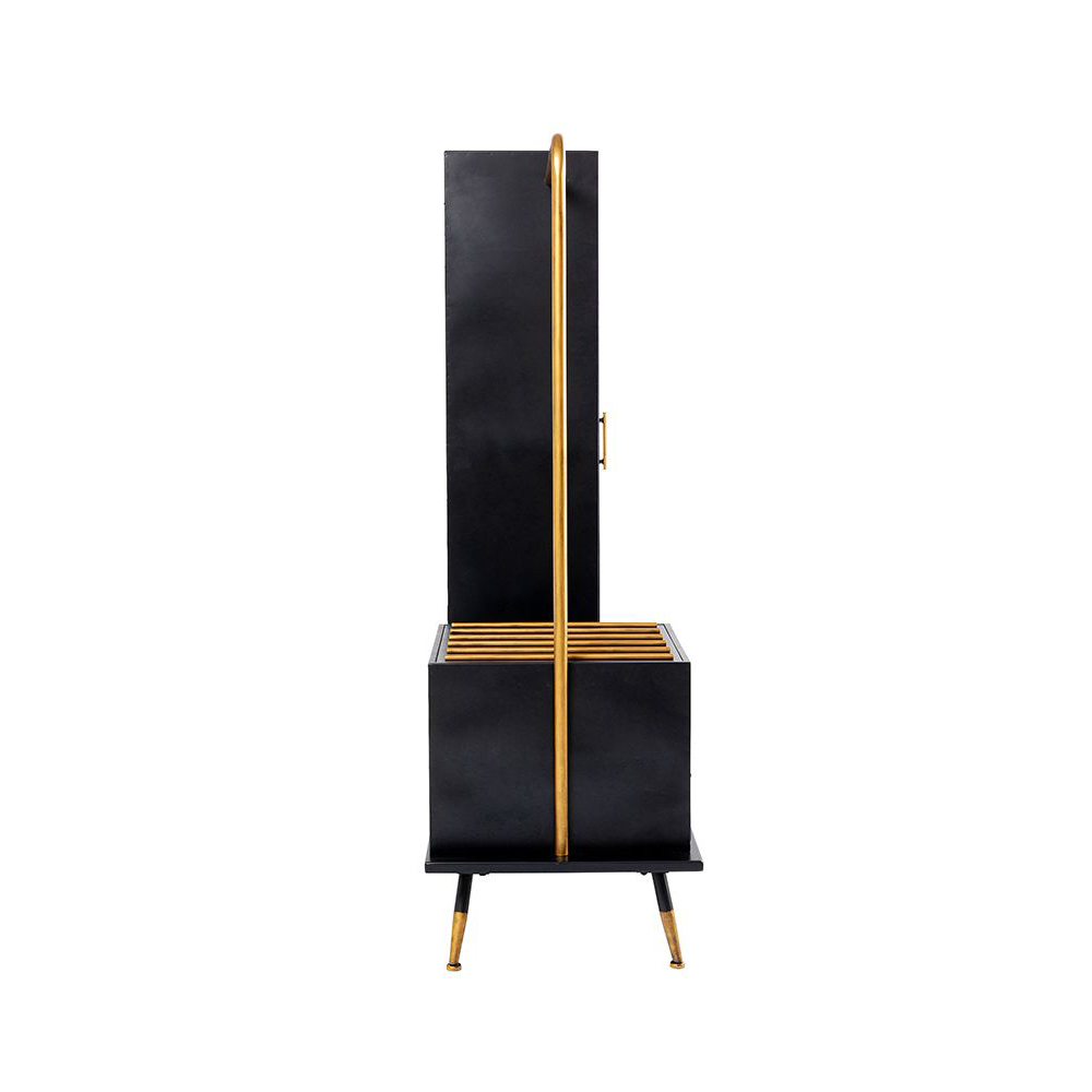 Dieser stilvolle Garderobenschrank vereint raffiniert Holz, Stahl und Glas zu einem modernen Materialmix. Im angesagten schwarz-goldenen Loft-Stil gehalten, überzeugt dieser Schrank nicht nur optisch, sondern auch mit seiner Funktionalität. Mit zwei geräumigen Schubladen, einer praktischen Kleiderstange und vier großzügigen Fächern schafft er Ordnung im Flur und bietet ausreichend Platz für Jacken, Schuhe und Accessoires. Dank der soliden Materialien wie Sicherheitsglas ist dieser Flur-Schrank besonders langlebig und robust. Jedes Detail dieses edlen Schranks ist teilweise handgearbeitet, was ihm eine einzigartige und hochwertige Ausstrahlung verleiht.