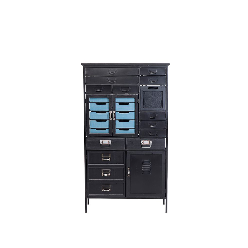Der hohe Schubladenschrank mit schwarz lackierten Fronten aus Stahl und zahlreichen liebevollen Details verströmt einen herrlich altmodischen Charme, ist jedoch so praktisch und durchdacht wie ein modernes Highboard. Die charmanten Metallgriffe im Retro-Stil runden das Gesamtbild perfekt ab und verleihen dem Schrank einen einzigartigen Look.