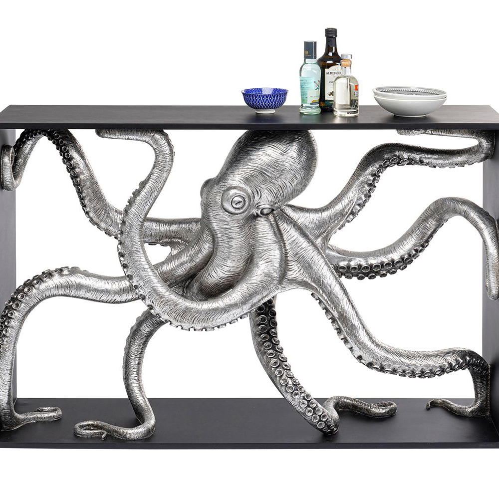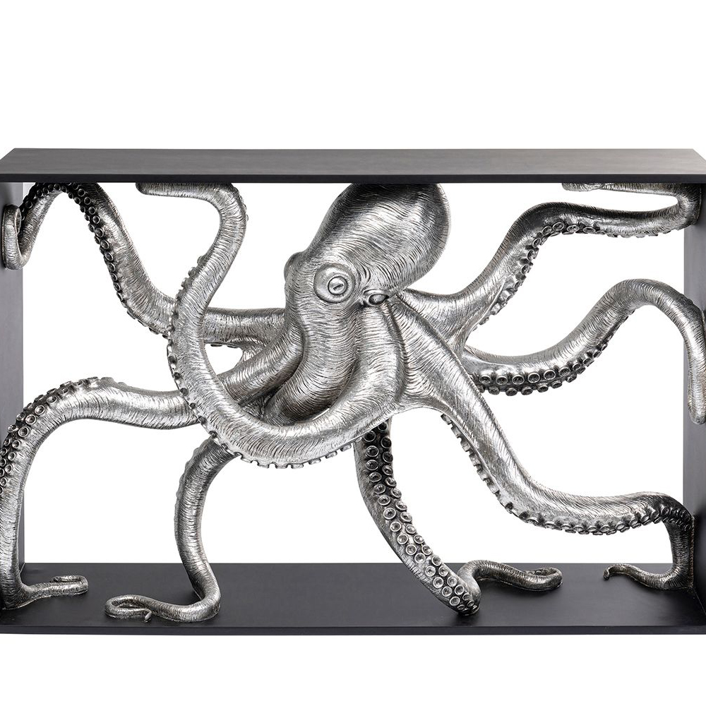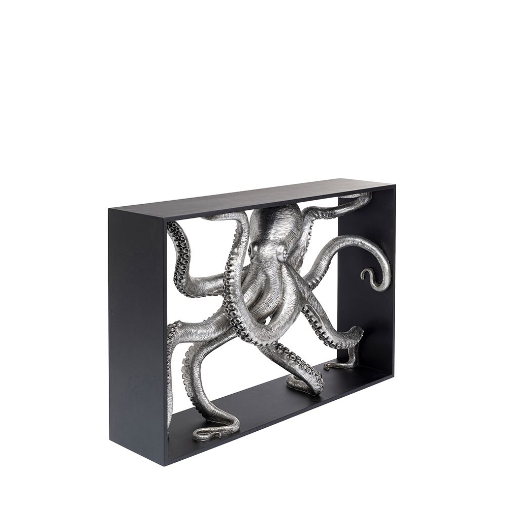 Der stabile Rahmen in Schwarz besteht aus Holz, während der Oktopus aus Kunststein in Silber gefertigt ist. Dieser Konsolentisch ist ein echter Eyecatcher im Wohnzimmer, Flur oder Schlafzimmer und zieht alle Blicke auf sich.
