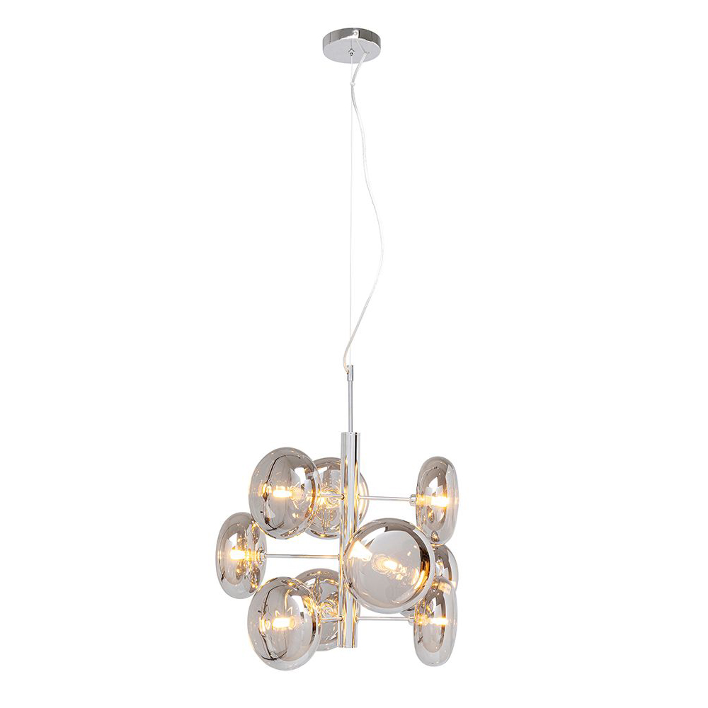 Die linsenförmigen Leuchtenschirme aus beschichtetem Glas verleihen der Lampe eine besondere Ausstrahlung. Die Hängeleuchte Headlight Chrome spendet indirektes Licht und schafft eine angenehme Atmosphäre im Raum. Mit einer Spannung von 230 V, einer Fassung G9 und Platz für 9 Leuchtmittel mit jeweils maximal 30 Watt (Leuchtmittel nicht inklusive) ist diese Lampe nicht nur ein optisches Highlight, sondern auch eine funktionale Lichtquelle.