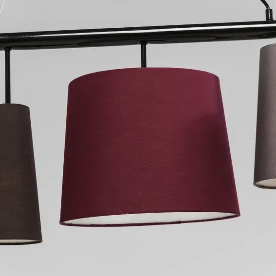 Zauberhafte Hängeleuchte mit fünf verschiedenen, farbigen Leuchtenschirmen - ein Style-Garant! Die Hängeleuchte ist perfekt geeignet, um über dem Esstisch oder dem Küchentresen angebracht zu werden, da sie ihr Licht nach unten abstrahlt. Sie ist anpassungsfähig an jede Einrichtung, aber gleichzeitig außergewöhnlich genug, um die Blicke auf sich zu ziehen. Die fünf Leuchtenschirme in den warmen Farben Beige, Braun, Weinrot, Schwarz und Gelb sorgen für ein gemütliches Licht. Die Hängeleuchte benötigt drei E27-Leuchtmittel und zwei E14-Leuchtmittel mit einer Spannung von 230 V und einer maximalen Leistung von 25 Watt. Die Leuchtmittel sind nicht im Lieferumfang enthalten.