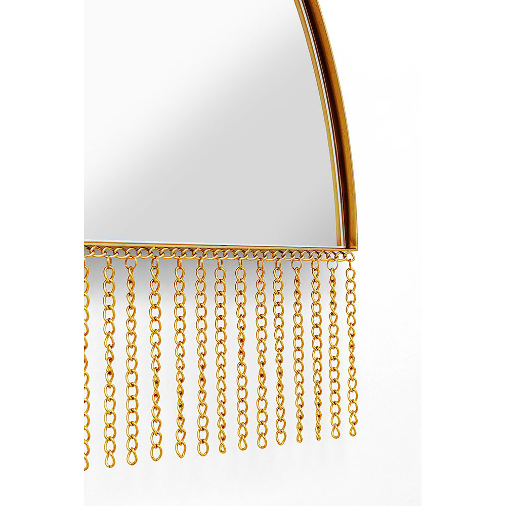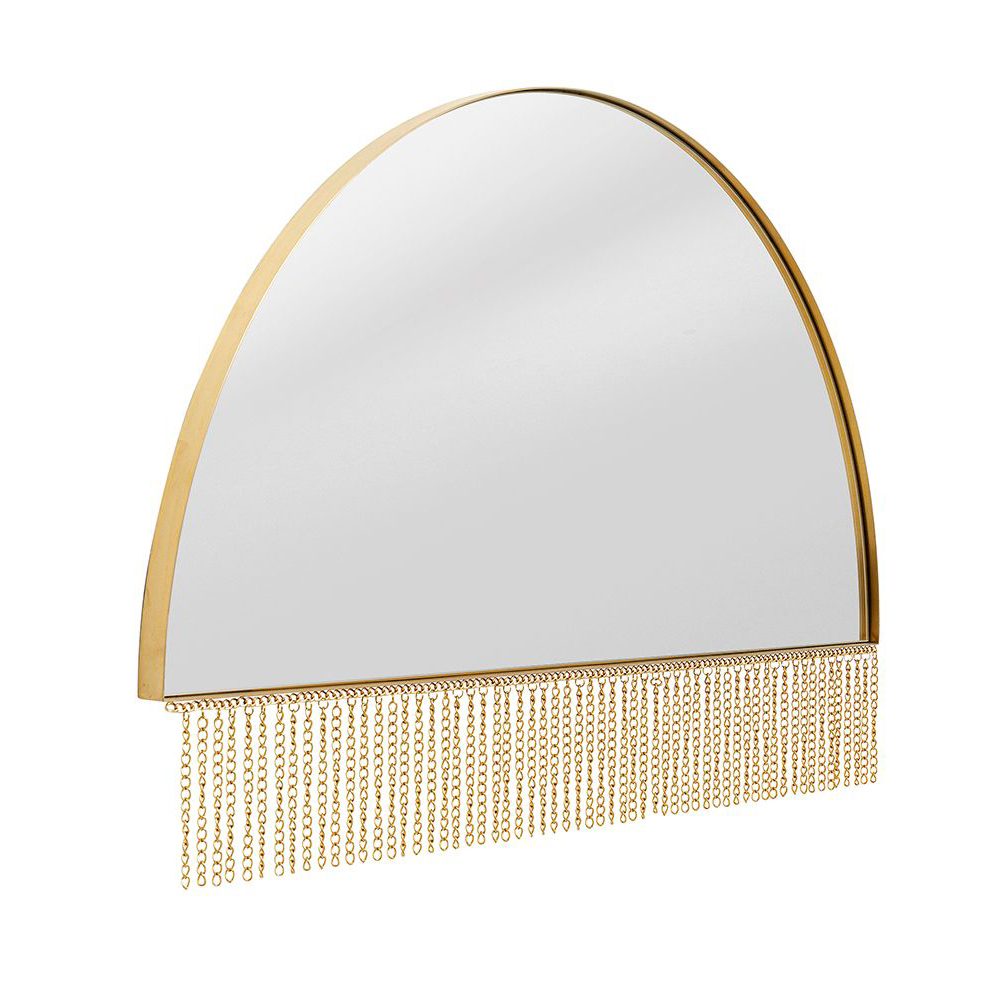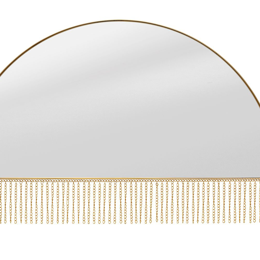 Der goldene Wandspiegel Opera Half ist ein atemberaubendes und innovatives Designobjekt für zeitgemäße Innenräume. Sein halbkreisförmiger Rahmen aus Stahl ist mit veredeltem Messing versehen und mit goldenen Metallketten verziert, was dem Spiegel eine einzigartige Ästhetik verleiht. Jedes Exemplar wird in Handarbeit gefertigt und ist somit ein Unikat. Mit einer großzügigen Spiegelfläche von 109x69 cm wird der Spiegel horizontal an der Wand montiert. Diese Wanddekoration bringt Helligkeit in Ihr Wohnzimmer, Schlafzimmer oder Flur und ist zugleich eine attraktive Wanddekoration, die jedem Raum einen stilvollen Touch verleiht.