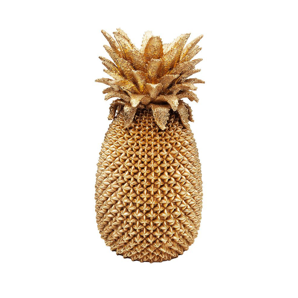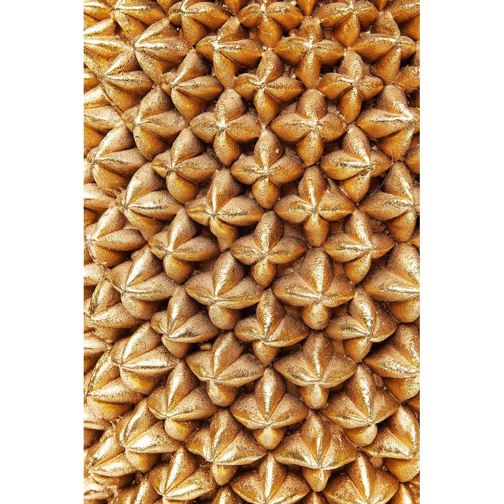 Eine geräumige Vase in Gold, gefertigt aus Polyresin, präsentiert sich in Form einer handgefertigten Ananas und strahlt mit viel Glamour und Gold - ein wahrer Hingucker! Selbst ohne Blumen begeistert sie als Solitär-Dekoration und verleiht jedem modernen Wohnstil einen exotischen Touch. Diese Vase ist perfekt für die Präsentation von exotischen Blüten wie Ingwer oder Strelitzien.