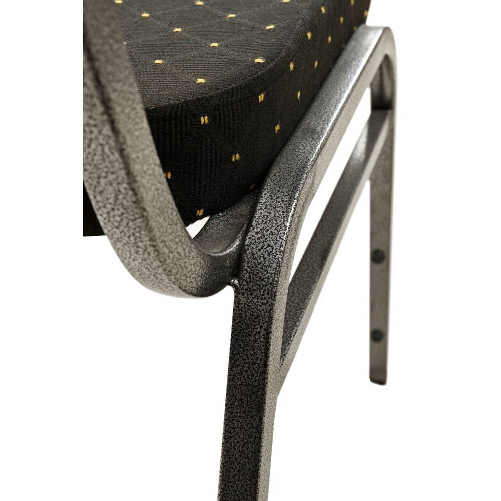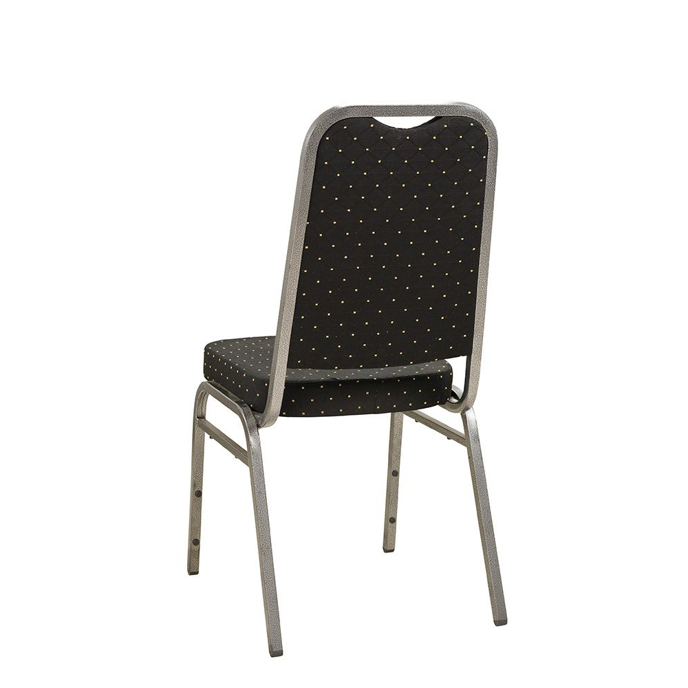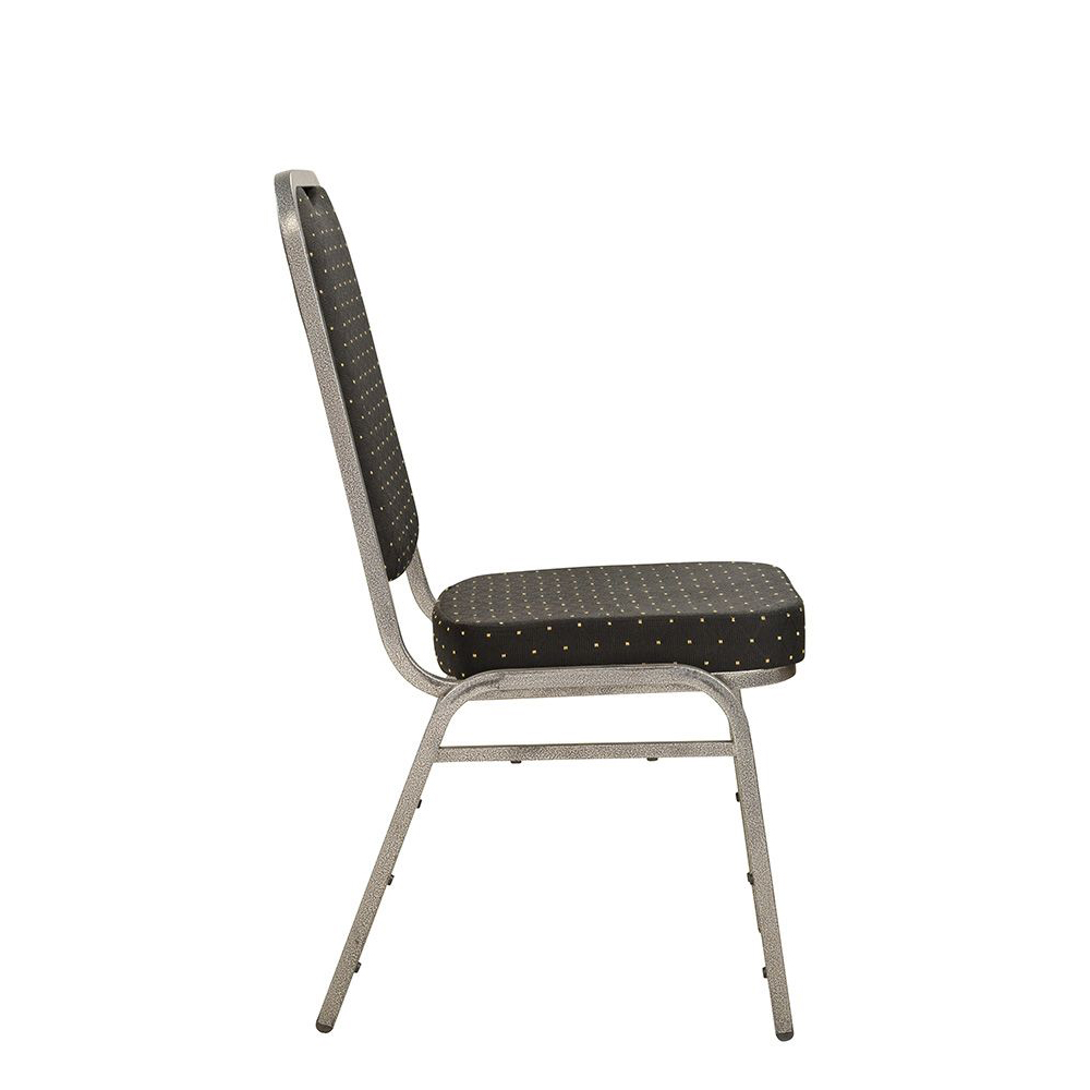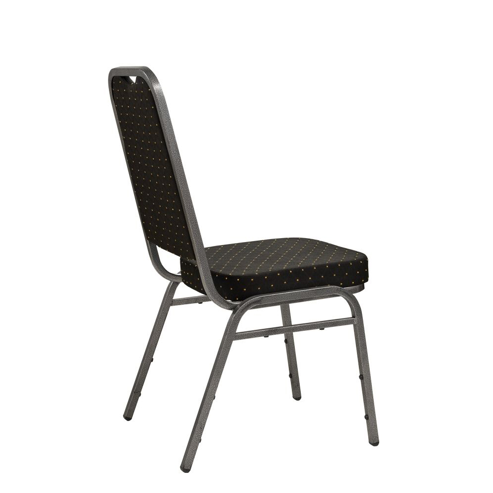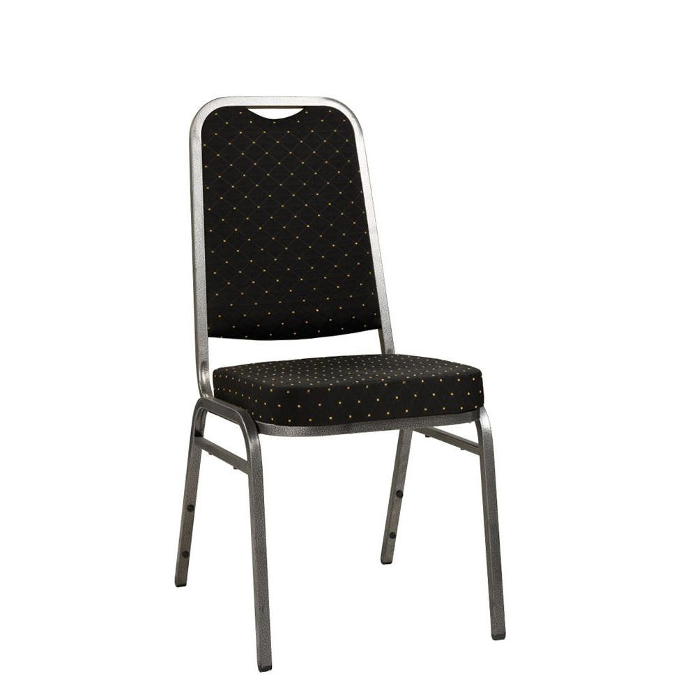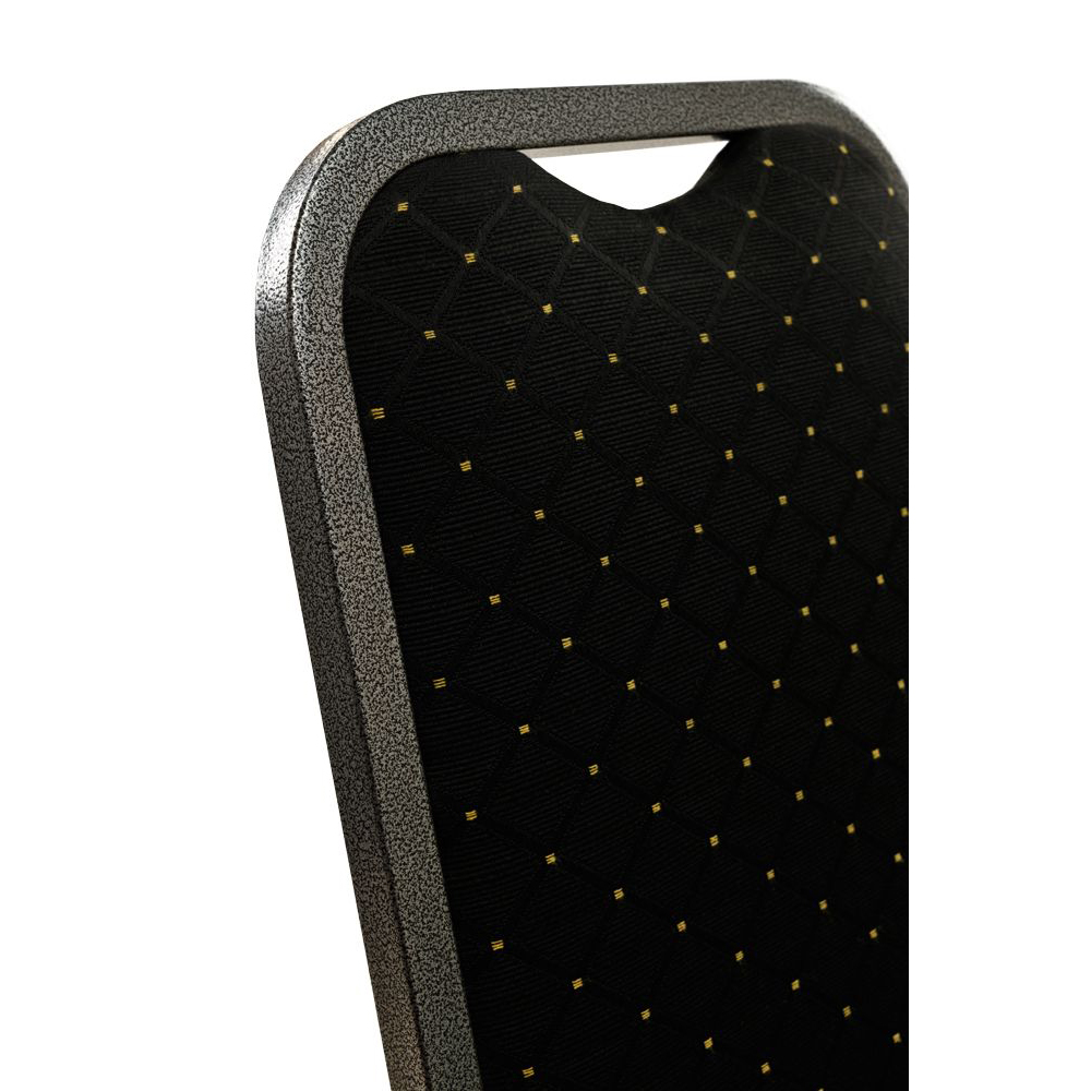 Der Bankettstuhl hat eine gepolsterte Sitz- und Rückenfläche. Das Gestell besteht standardmäßig aus Aluminium.