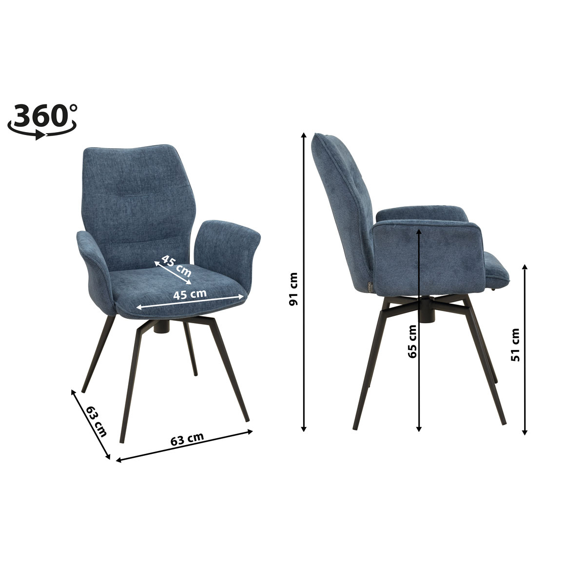 Der FONDI-Arm Caerula ist ein Vollpolsterstuhl mit Metallgestell und 360 Grad Drehfunktion. Perfekt geeignet für Gastronomie & Hotellerie.Maße:Breite 63 cmHöhe 91 cmTiefe 63 cmArmlehnenhöhe 65 cmSItzhöhe 51 cmSitzbreite 45 cmSitztiefe 45 cm