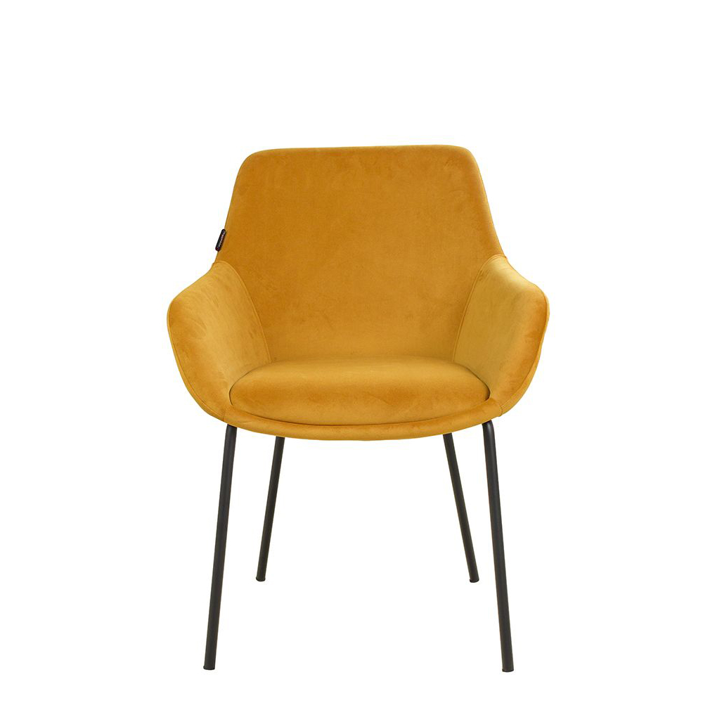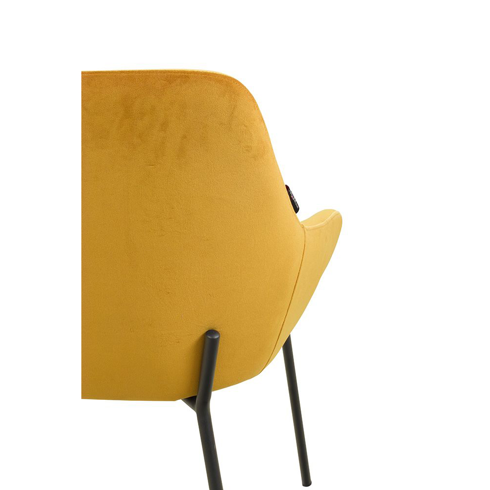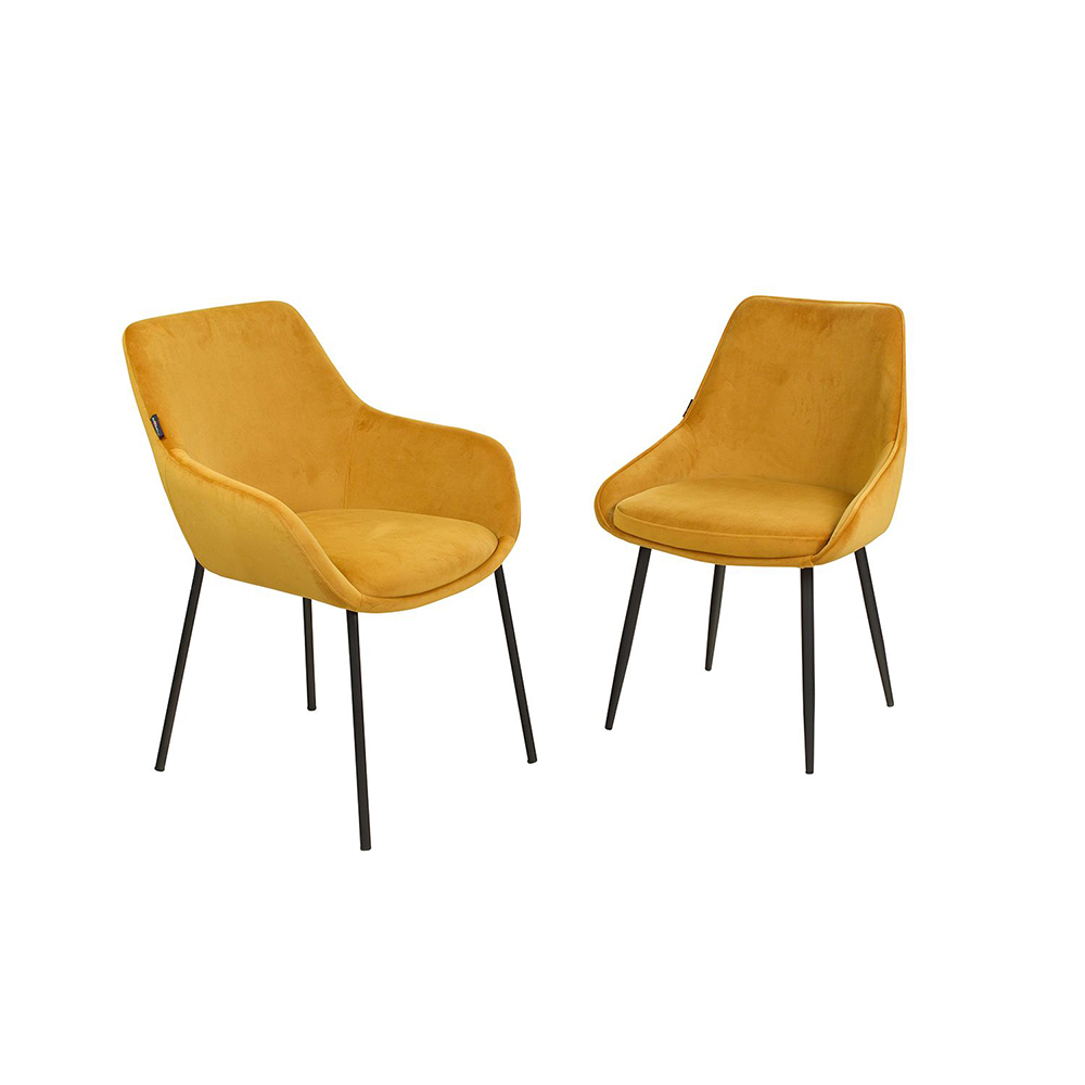 Der Revogo ist ein Vollpolsterstuhl mit Metallgestell, der mit Veloursstoff bezogen ist. Der Bezug hat einen samtartigen Glanz und fühlt sich angenehm weich an.