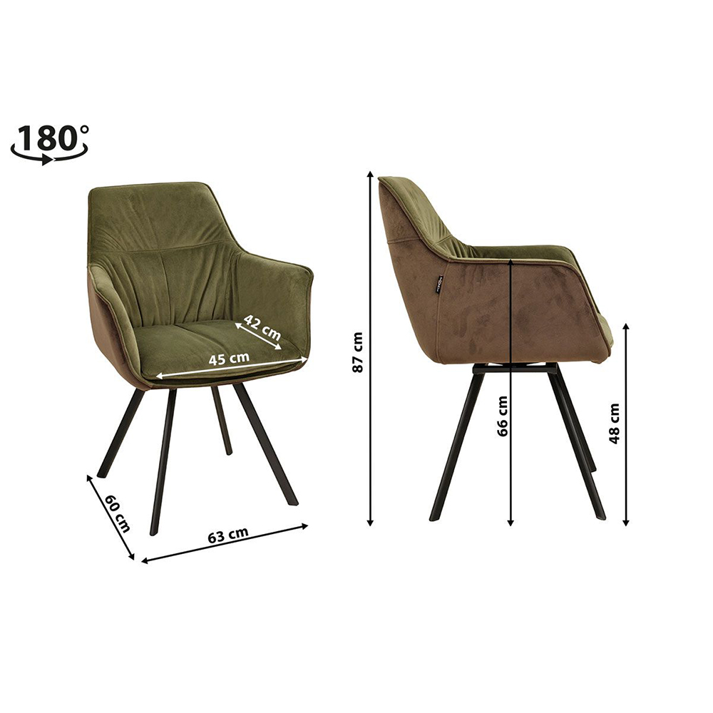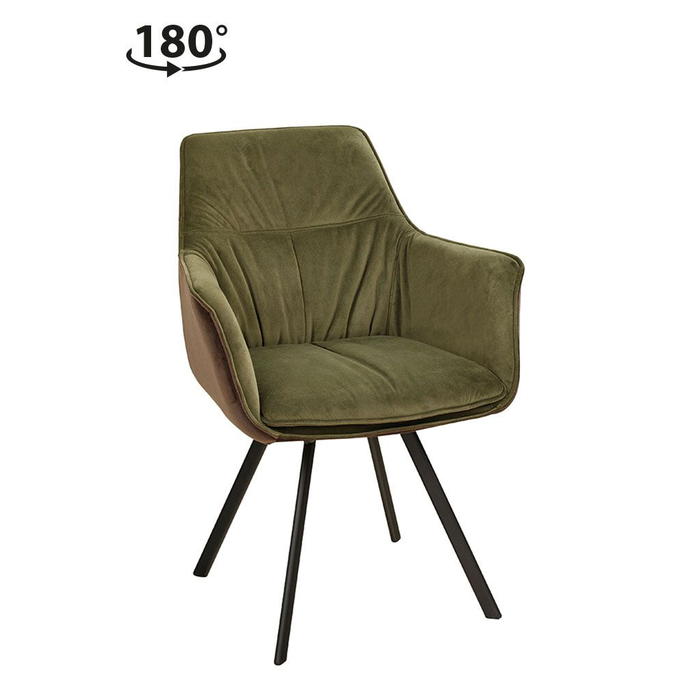 Der Voggo Arm Forest Duotone ist ein Vollpolsterstuhl mit Armlehne und drehbarem Metallgestell, der mit Veloursstoff bezogen ist. Der Bezug hat einen samtartigen Glanz und fühlt sich angenehm weich an.