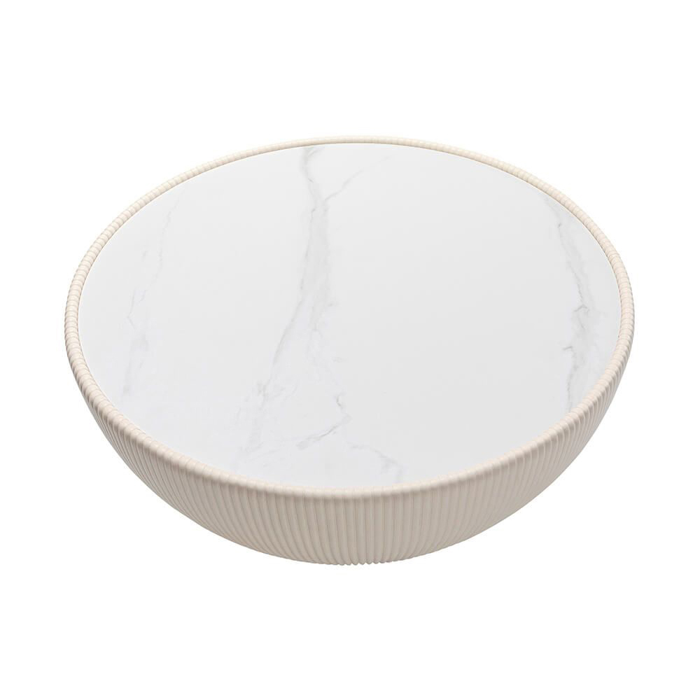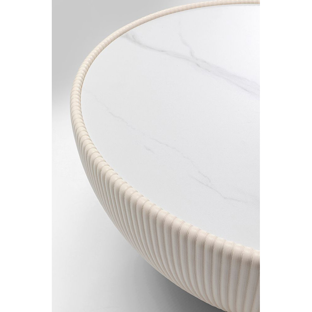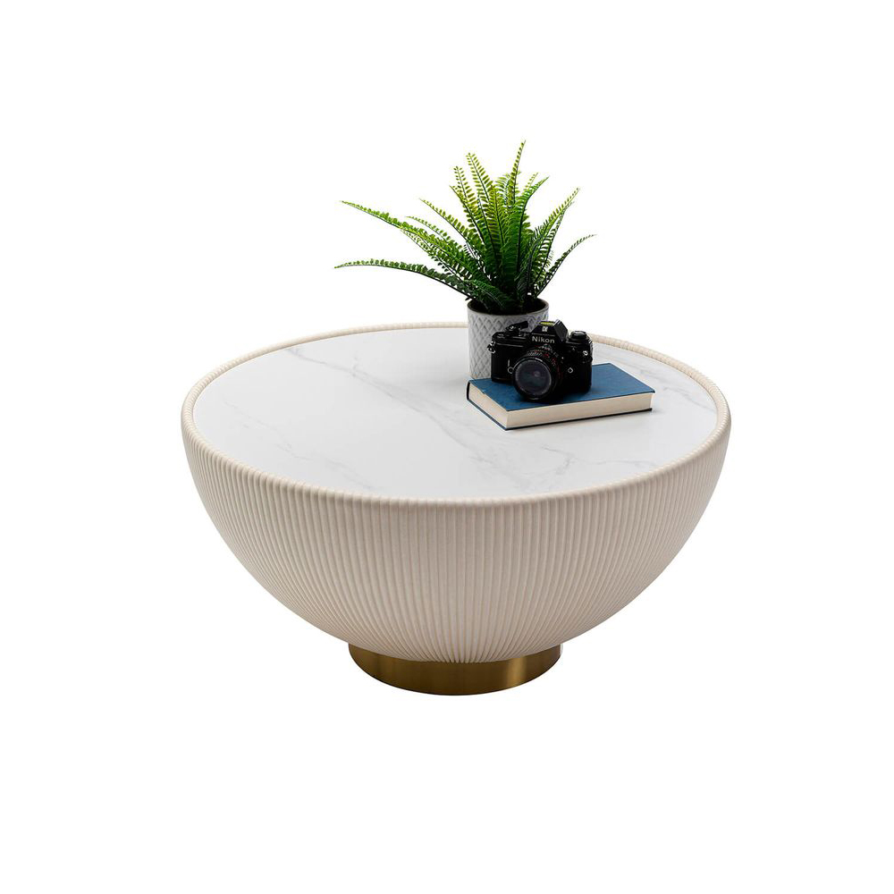 Ein runder Couchtisch in einem sanften Creme-Weiß, der sowohl als eleganter Beistelltisch im Wohnzimmer als auch als Nachttisch im Schlafzimmer fungiert. Sein Blickfang ist der gesteppte Bezug aus Kunstleder, der ihm einen besonderen Charme verleiht.