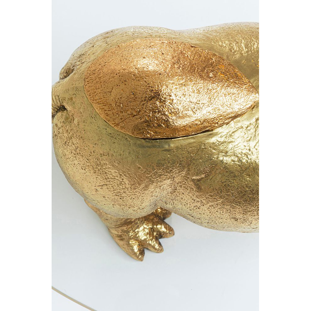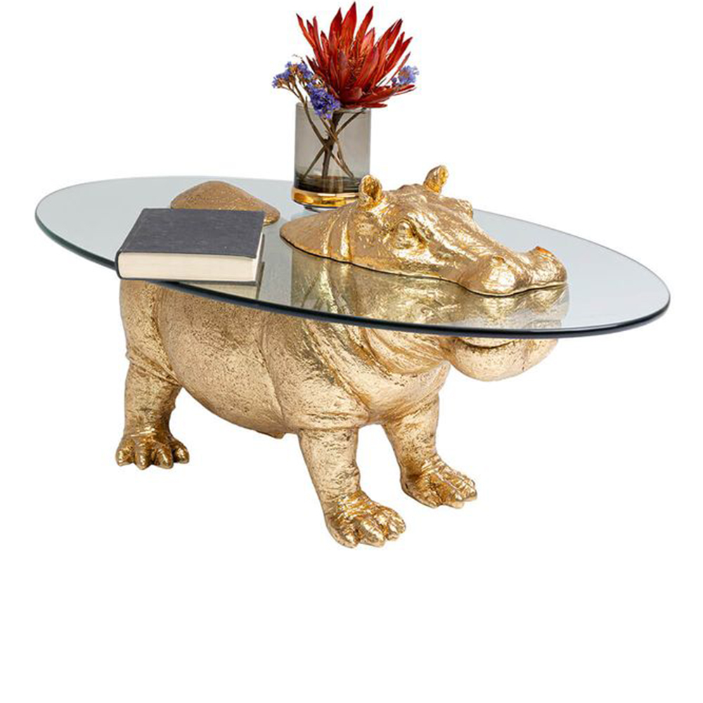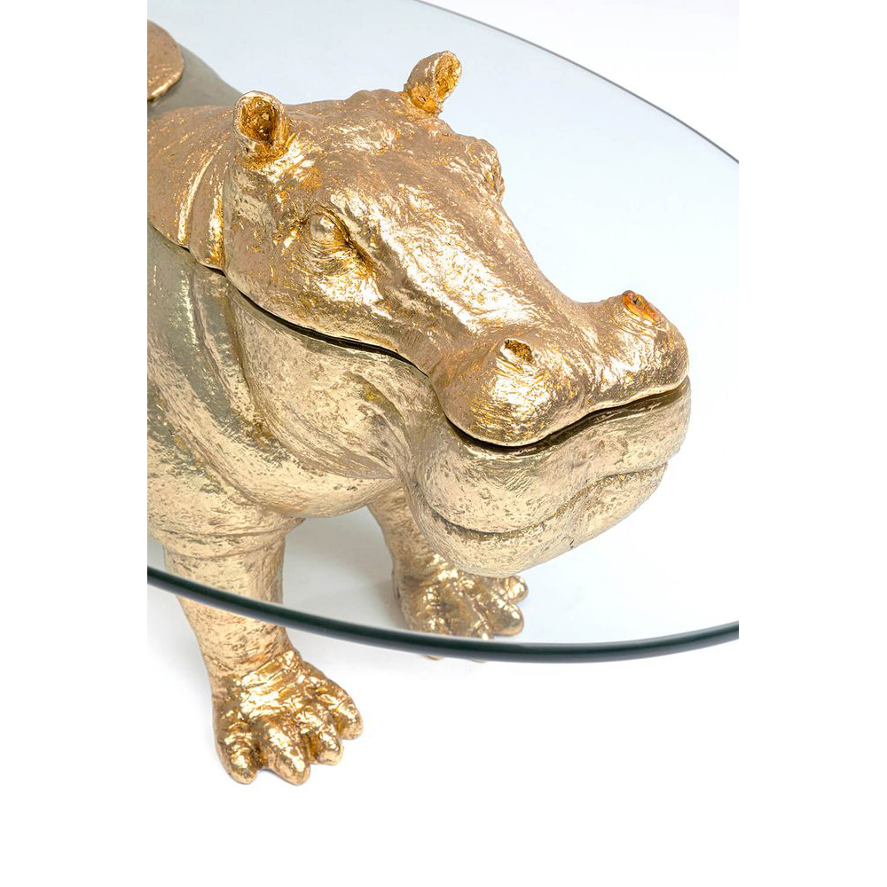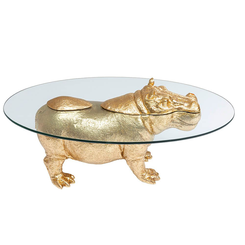 Das goldene Nilpferd verleiht diesem Wohnzimmer-Tisch aus Glas einen einzigartigen Blickfang. Die große, ovale Tischplatte besteht aus 7 mm dickem ESG-Sicherheitsglas mit geschliffener Kante und misst 80 cm in der Länge und 32 cm in der Tiefe. Der Couchtisch ist vielseitig kombinierbar und passt sowohl zu klassischen als auch modernen Einrichtungsstilen.