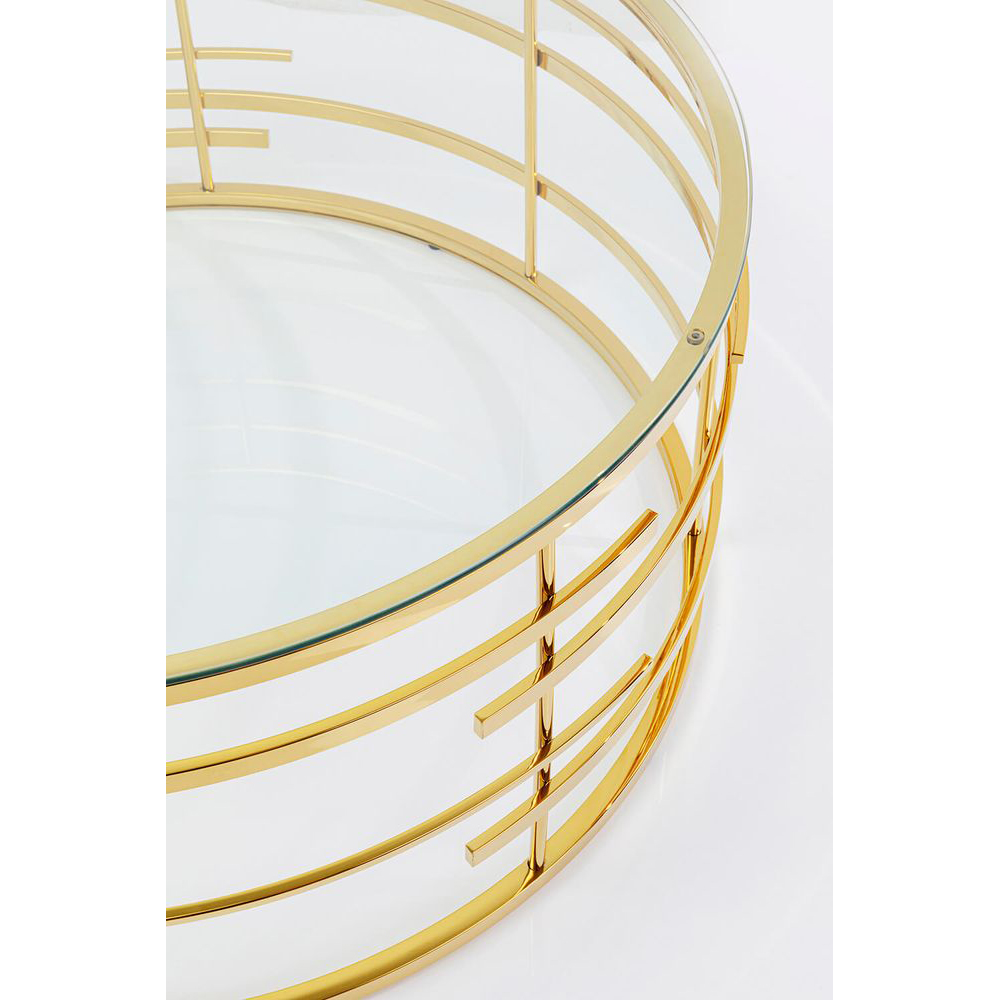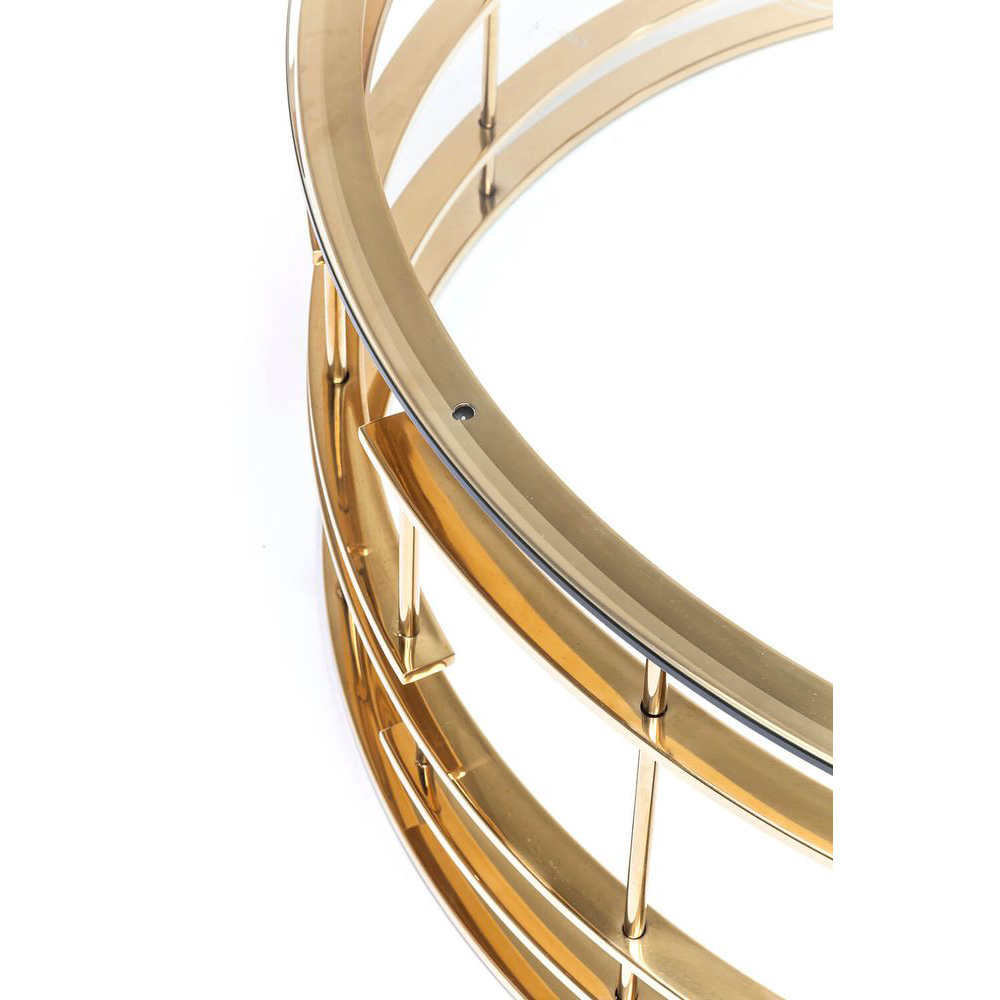 Ein runder Couchtisch mit einem glamourösen Touch, dank seines aufregenden goldenen Gestells aus Edelstahl und einer Glasplatte. Dieser luxuriöse Glastisch verleiht dem Raum, sei es als Ergänzung zum Ecksofa oder als Nachttisch neben dem Bett, einen stilvollen Akzent. Die runde Form des Couchtisches harmoniert ideal mit kubischen und eckigen Sofas und macht Jupiter zu einem Highlight in jedem Interieur.