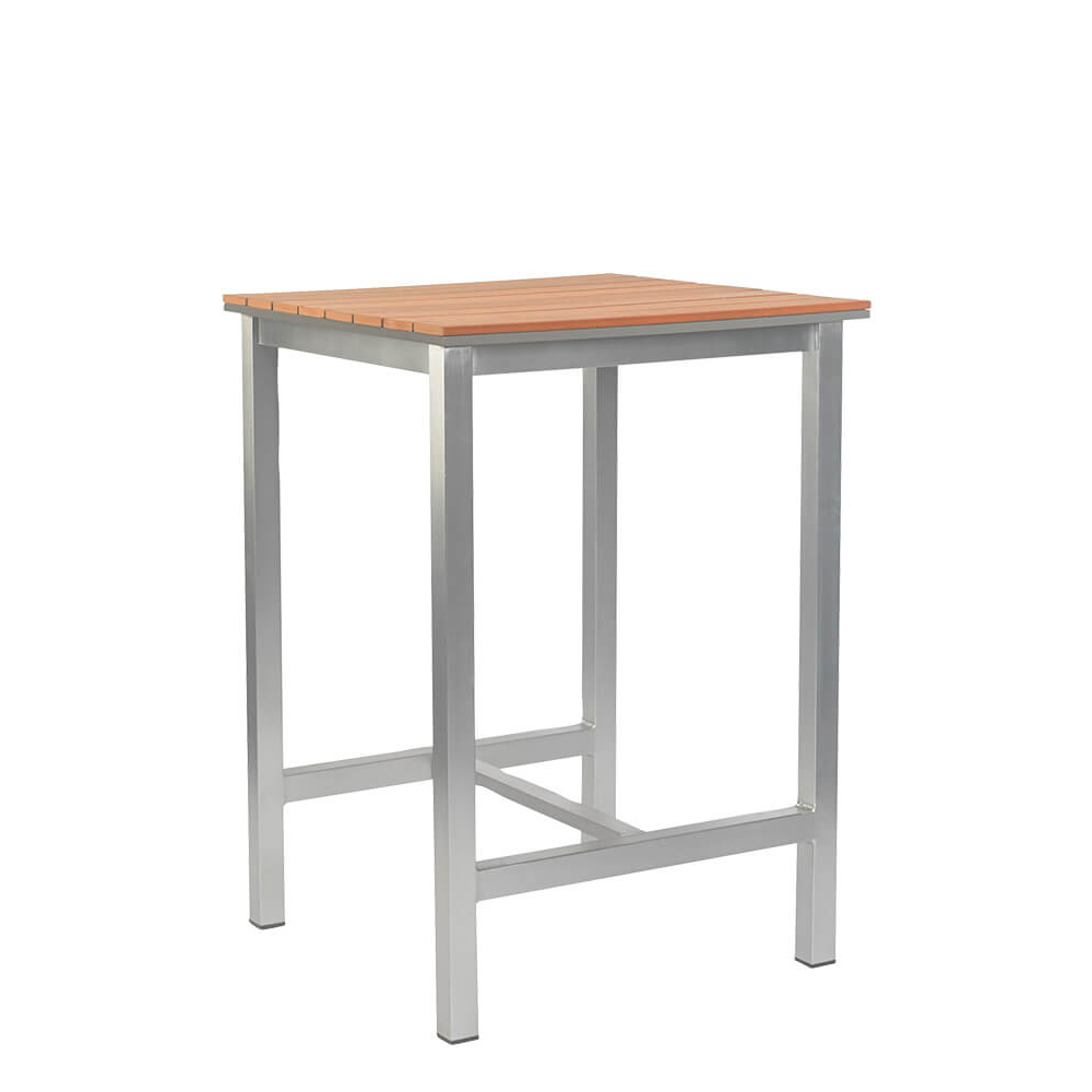 Das Simeo-High-Tischgestell mit Polywood-Lattung eignet sich hervorragend für den Außenbereich, insbesondere für Bars.