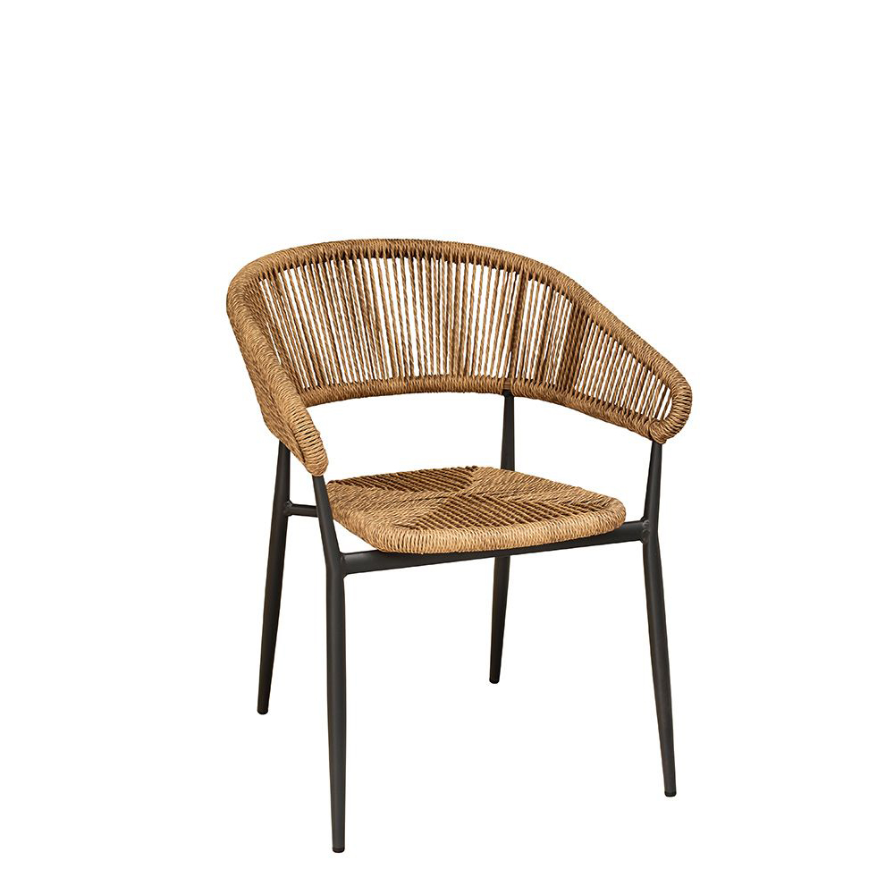 Ein Terrassenstuhl mit Armlehnen für höheren Sitzkomfort. Sitz und Rücken sind mit strapazierfähigen, witterungsbeständigem und pflegeleichtem Outdoorseil bespannt. Das Seil ist schnell trocknend. Der Stuhl ist stapelbar.