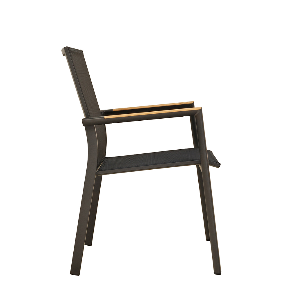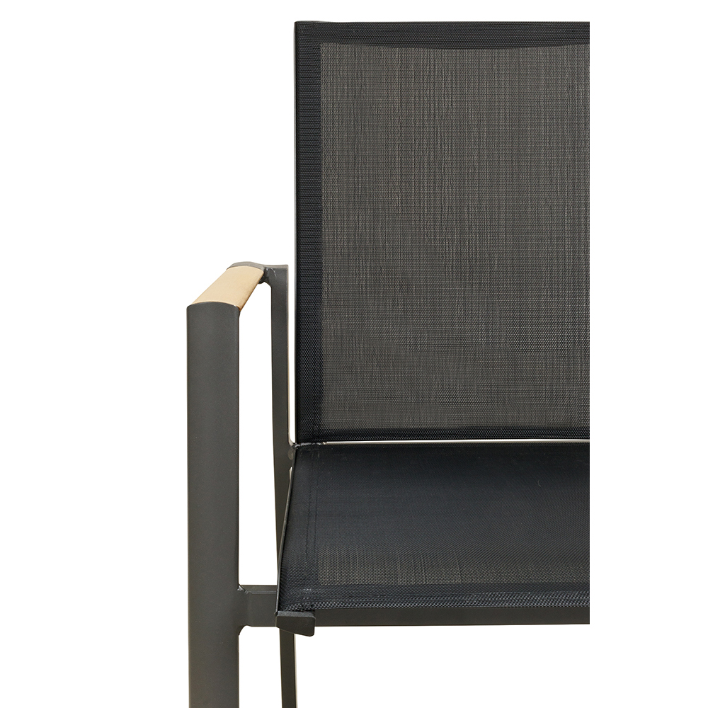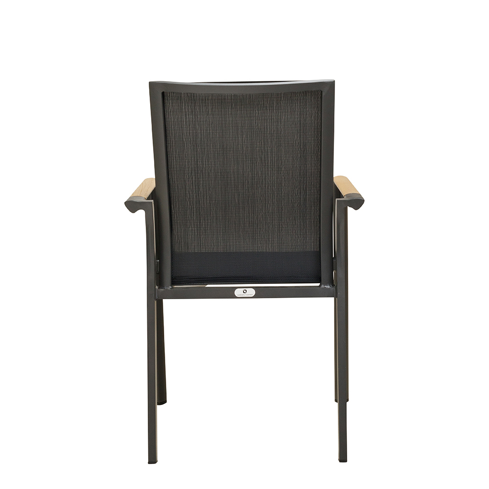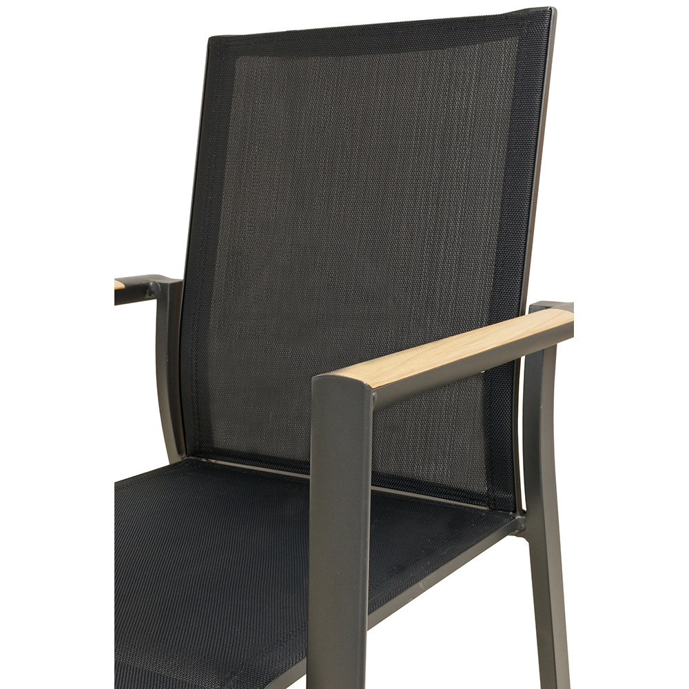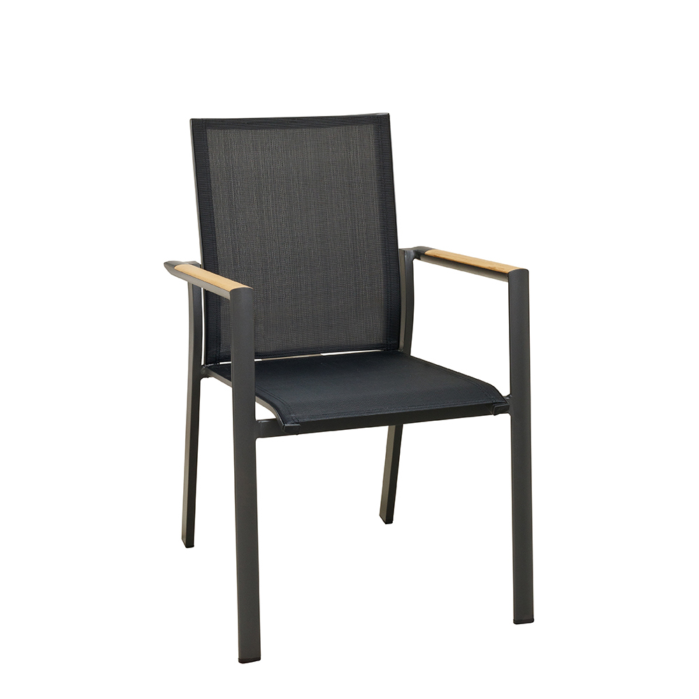 Der Neptun Anthrazit ist der funktionale und stilvolle Begleiter für alle Außenbereiche im Gastronomie, Hotellerie und Eventsektor. Mit seinem robusten Aluminium-Gestell und den wetterbeständigen Textylen-Sitz- und Rückenflächen bietet der Stuhl Sitzkomfort und langlebige Qualität. Die eleganten Armlehnen in Teakholz verleihen dem Stuhl eine natürliche Ästhetik und harmonieren mit modernen Outdoor-Designs. Dank der Stapelbarkeit und des leichten Gewichts von nur 3,8 kg ist der Neptun Anthrazit äußerst praktisch in der Handhabung und ermöglicht einen schnellen, platzsparenden Einsatz.