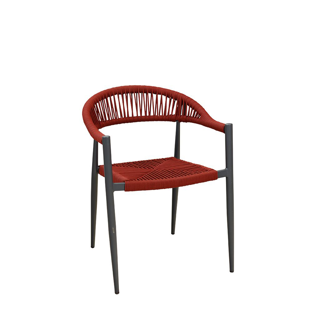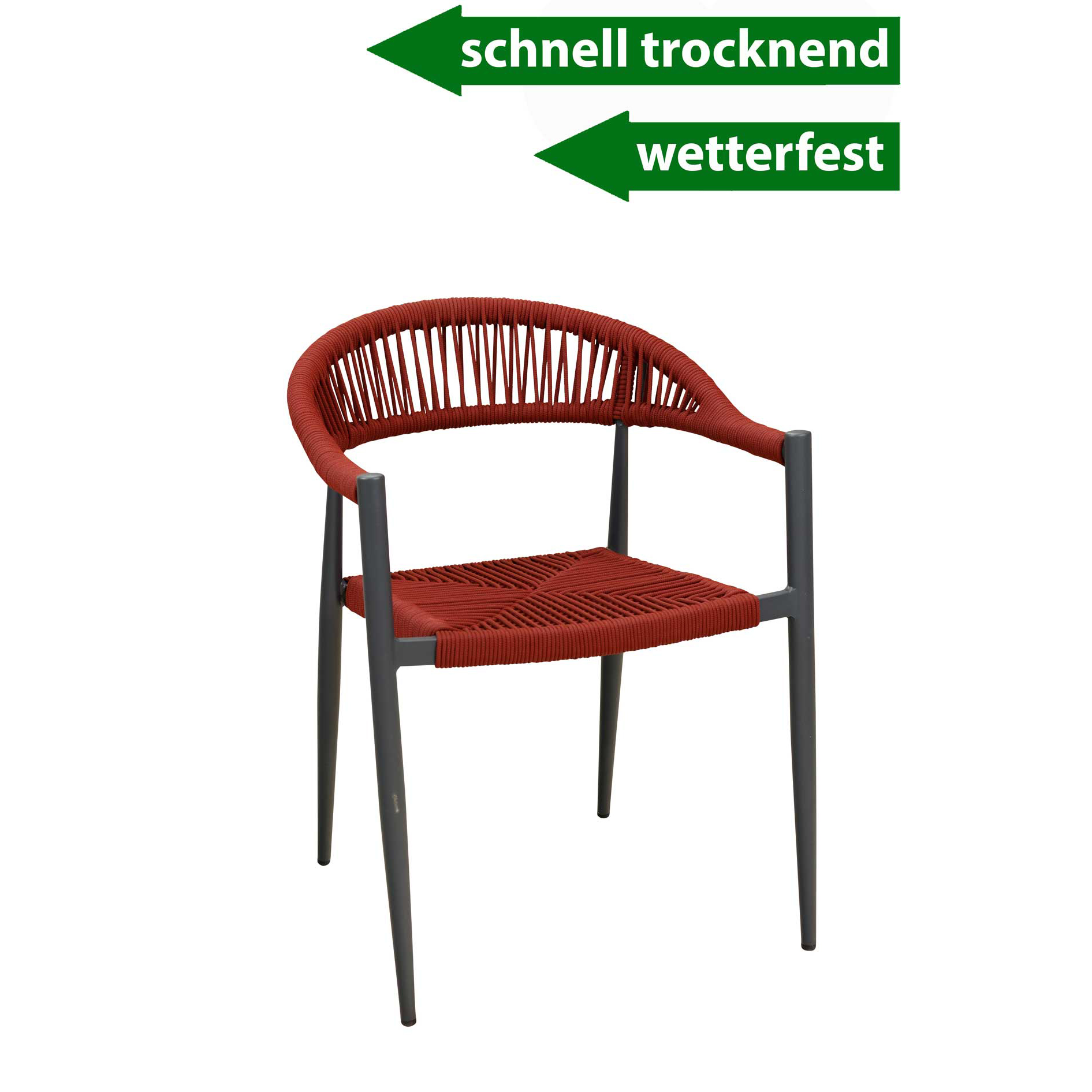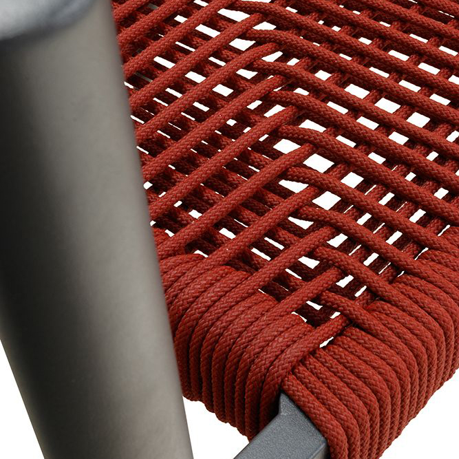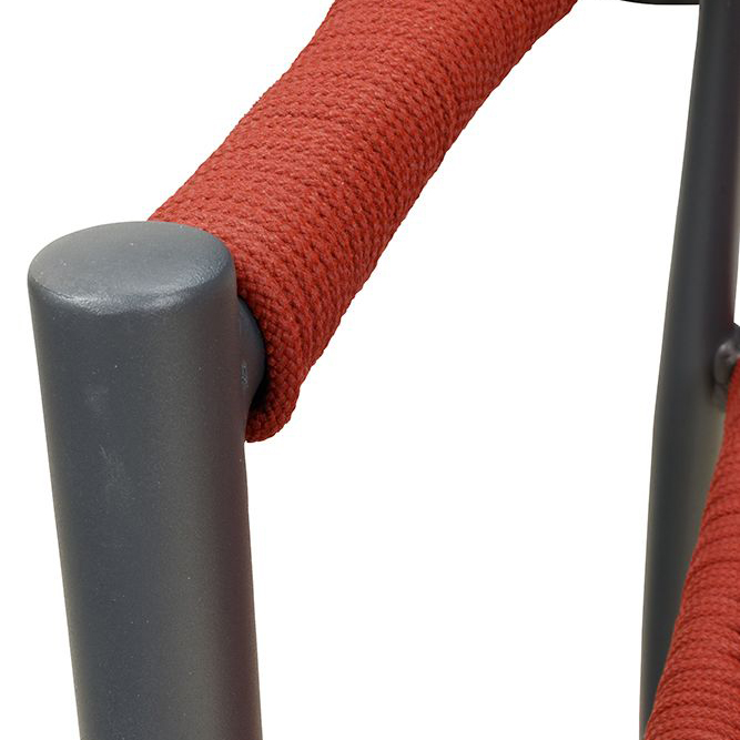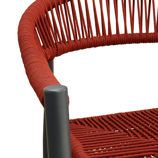 Ein Terrassenstuhl mit Armlehnen für höheren Sitzkomfort. Sitz und Rücken sind mit strapazierfähigen, witterungsbeständigem und pflegeleichtem Outdoorseil bespannt. Das Seil ist schnell trocknend. Der Stuhl ist stapelbar.