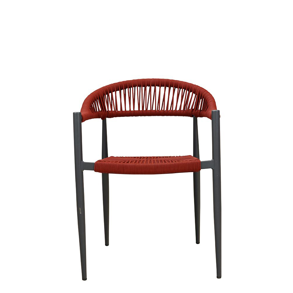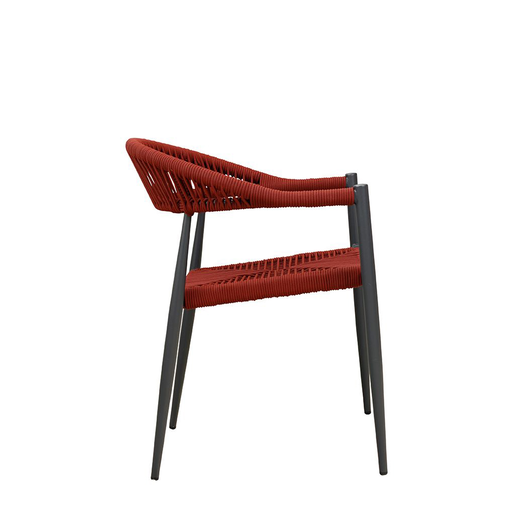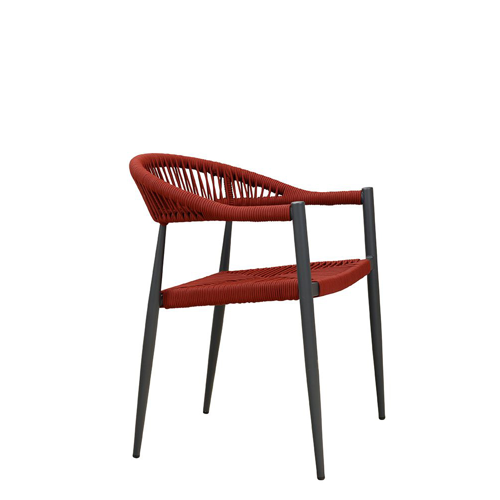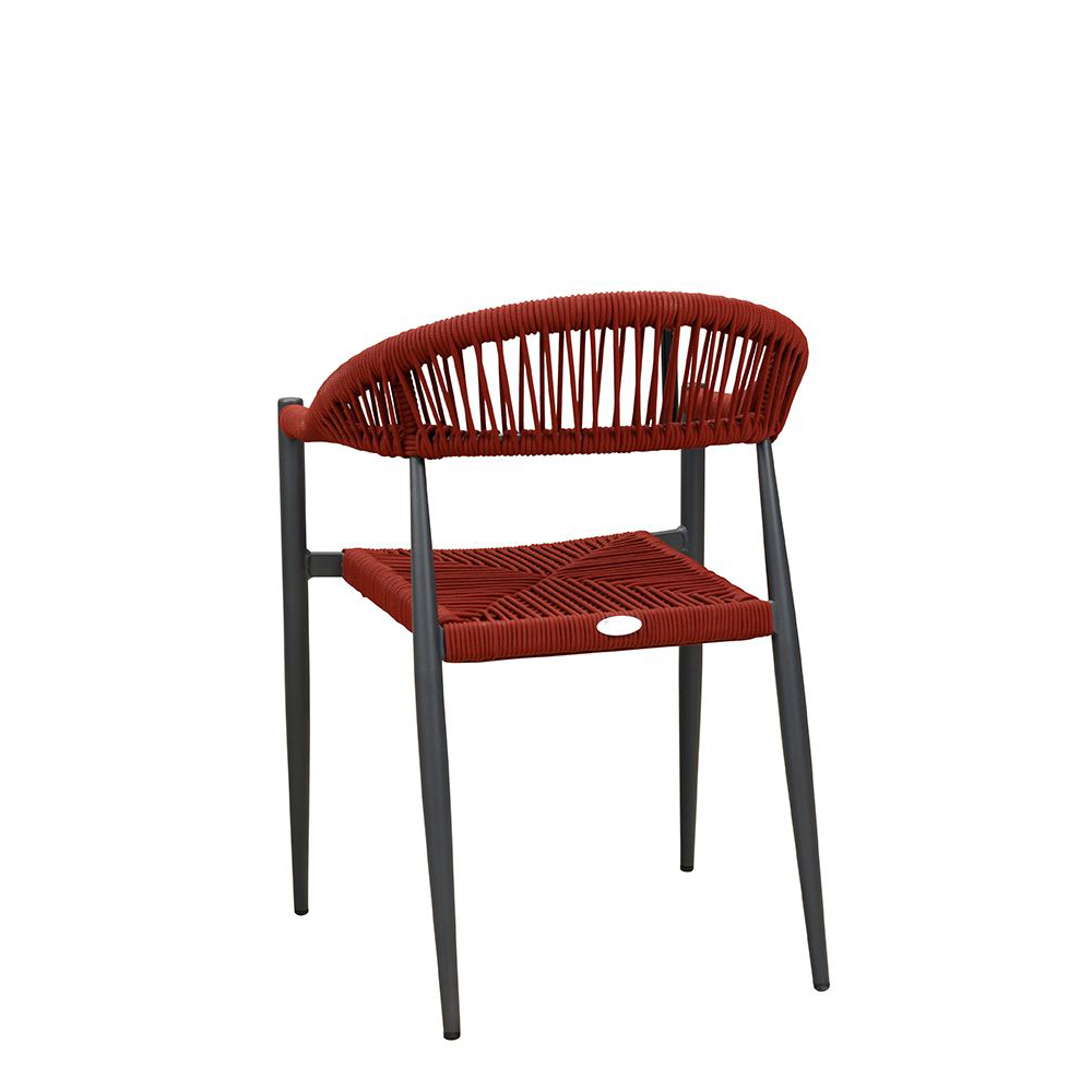 Ein Terrassenstuhl mit Armlehnen für höheren Sitzkomfort. Sitz und Rücken sind mit strapazierfähigen, witterungsbeständigem und pflegeleichtem Outdoorseil bespannt. Das Seil ist schnell trocknend. Der Stuhl ist stapelbar.
