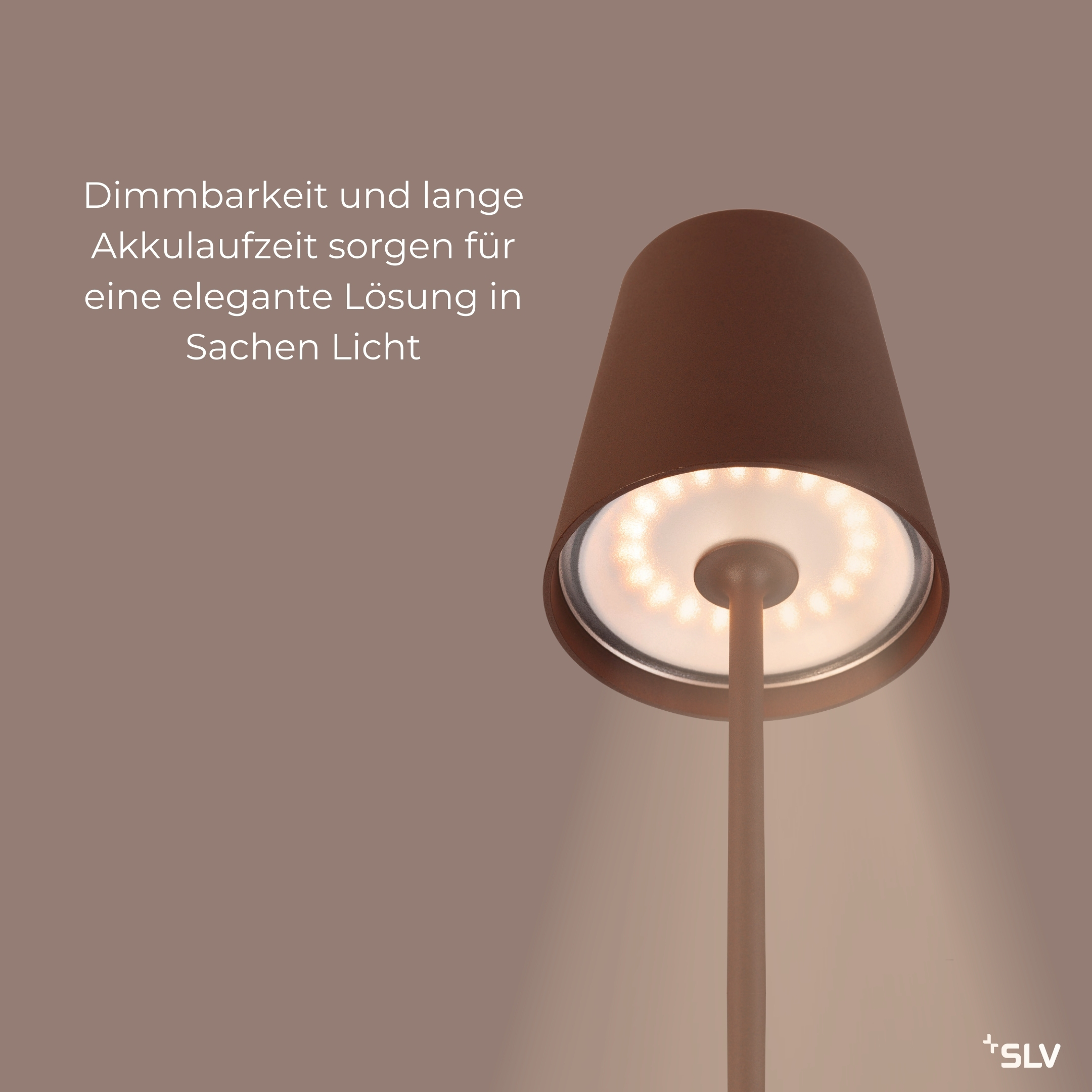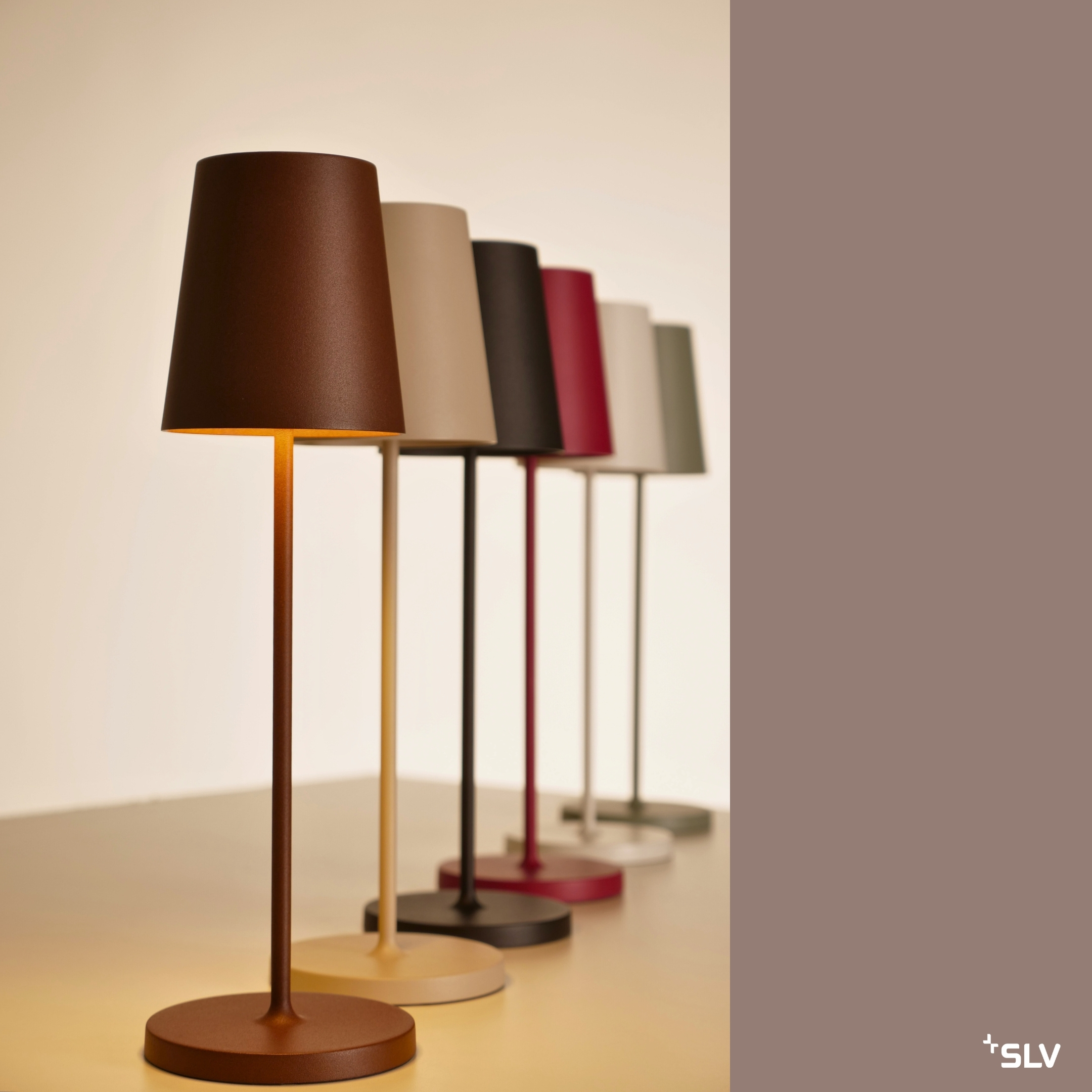 VINOLINA TWO heißt die hochwertig aus Aluminium gefertigte Tischleuchte, die sich dank Schutzart IP65 auch nach draußen mitnehmen lässt. In ihrem zeitlosen Design verströmt sie mit einer einzigen Akkuladung 10 Stunden ein nach oben und unten gerichtetes Licht, dessen Farbtemperatur via CCT-Switch einstellbar ist (2200K/2700K/3000K). Dabei ist die mobile Leuchte in sechs verschiedenen Trendfarben erhältlich. Die Ladestation ist mitsamt USB-Kabel im Lieferumfang enthalten. Erleben Sie mit VINOLINA TWO eine elegante Lösung in Sachen Licht, die via Touchschalter noch dimmbar ist.