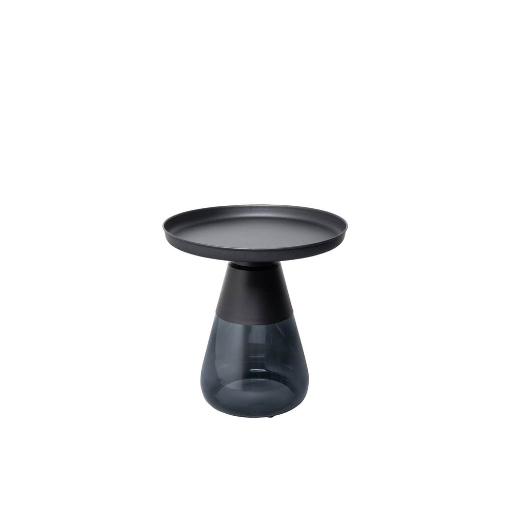 Ein runder Beistelltisch aus dunkelgrauem Metall präsentiert ein modernes und luxuriöses Design, insbesondere dank seines Tischfußes aus gefärbtem Glas. Die transparente Leichtigkeit und die zeitlose Form machen Bottilia zu einem Design-Highlight neben Sofa und Sessel. Die Lieferung erfolgt sicher verpackt und bereits montiert.