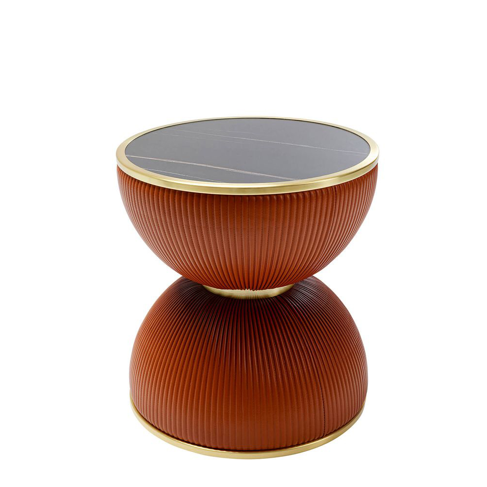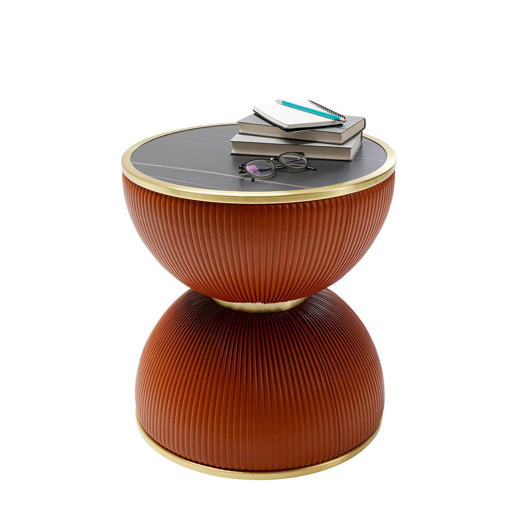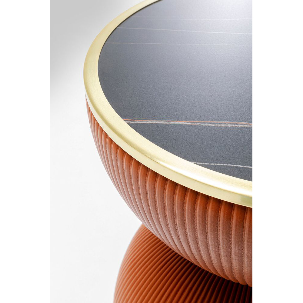 Ein runder Beistelltisch in Braun mit einer dunklen Tischplatte aus Sincerestone, die eine marmorierte Optik aufweist. Der pflegeleichte Bezug besteht aus beschichtetem Textil mit einer geradlinigen Steppung. Dieser Tisch verschönert jeden Raum neben dem Sofa, der Couch oder als Nachttisch und verleiht Ihrem Raum sofort eine edle Note.