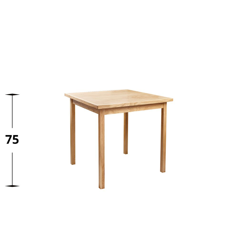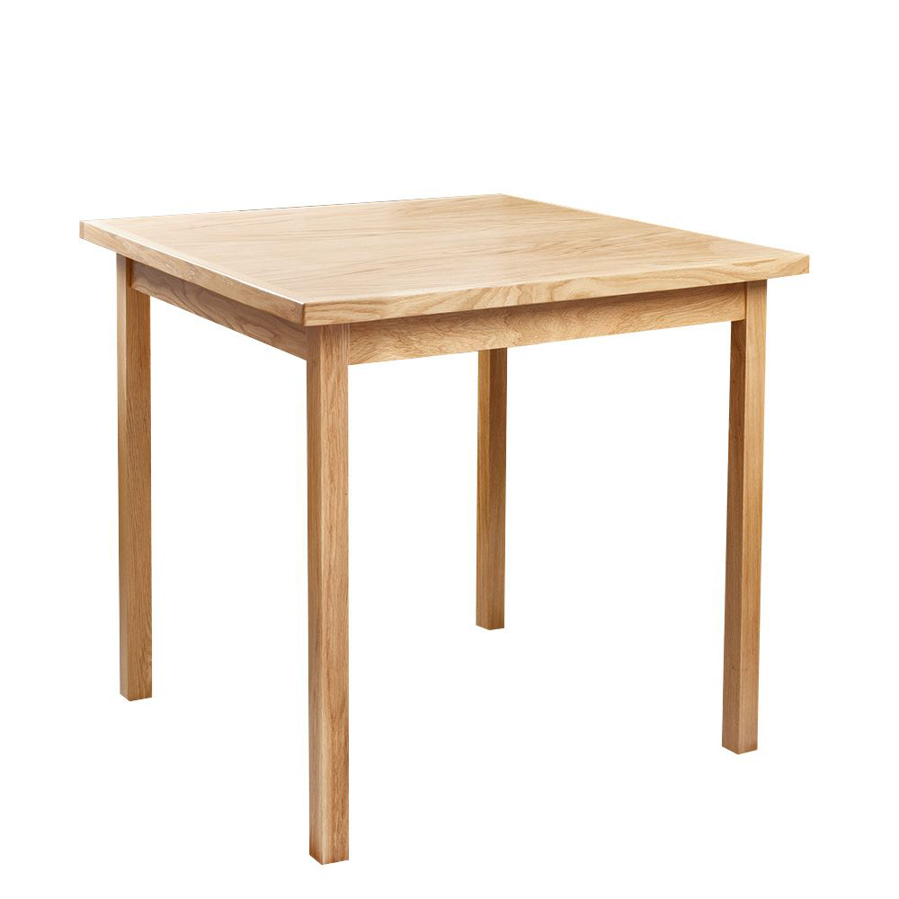 Massiver Holztisch mit einem Gestell aus Eichenholz und und einer 80 x 80 cm Tischplatte aus 25 mm Eichenholzfurnier.