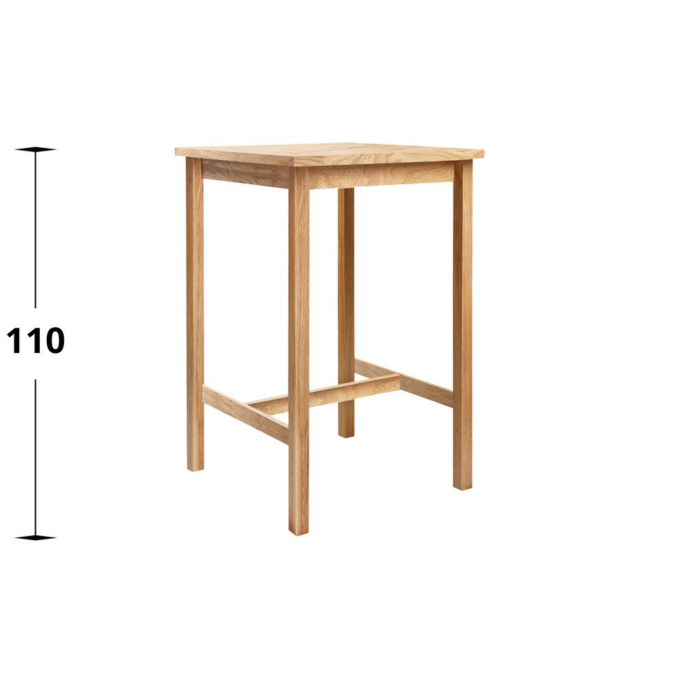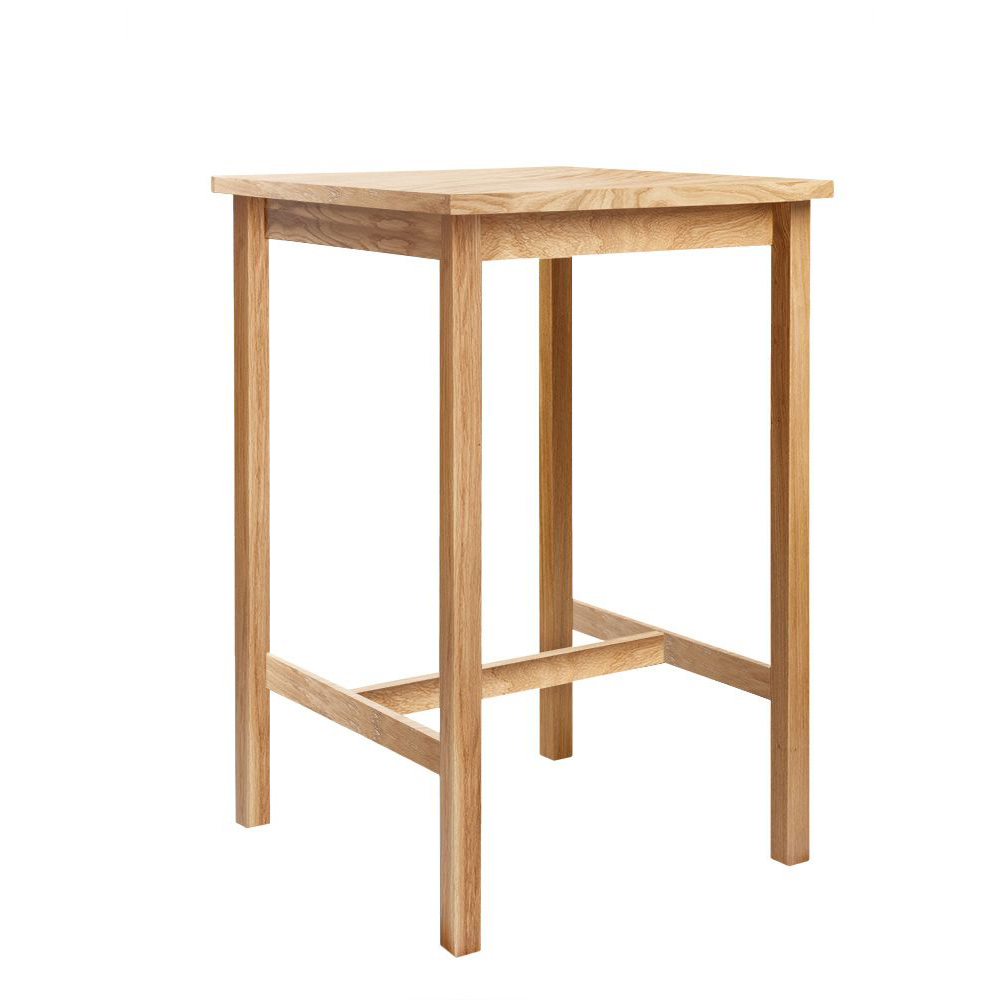 Massiver Stehtisch mit einem Gestell aus Eichenholz und und einer 80 x 80 cm Tischplatte aus 25 mm Eichenholzfurnier.